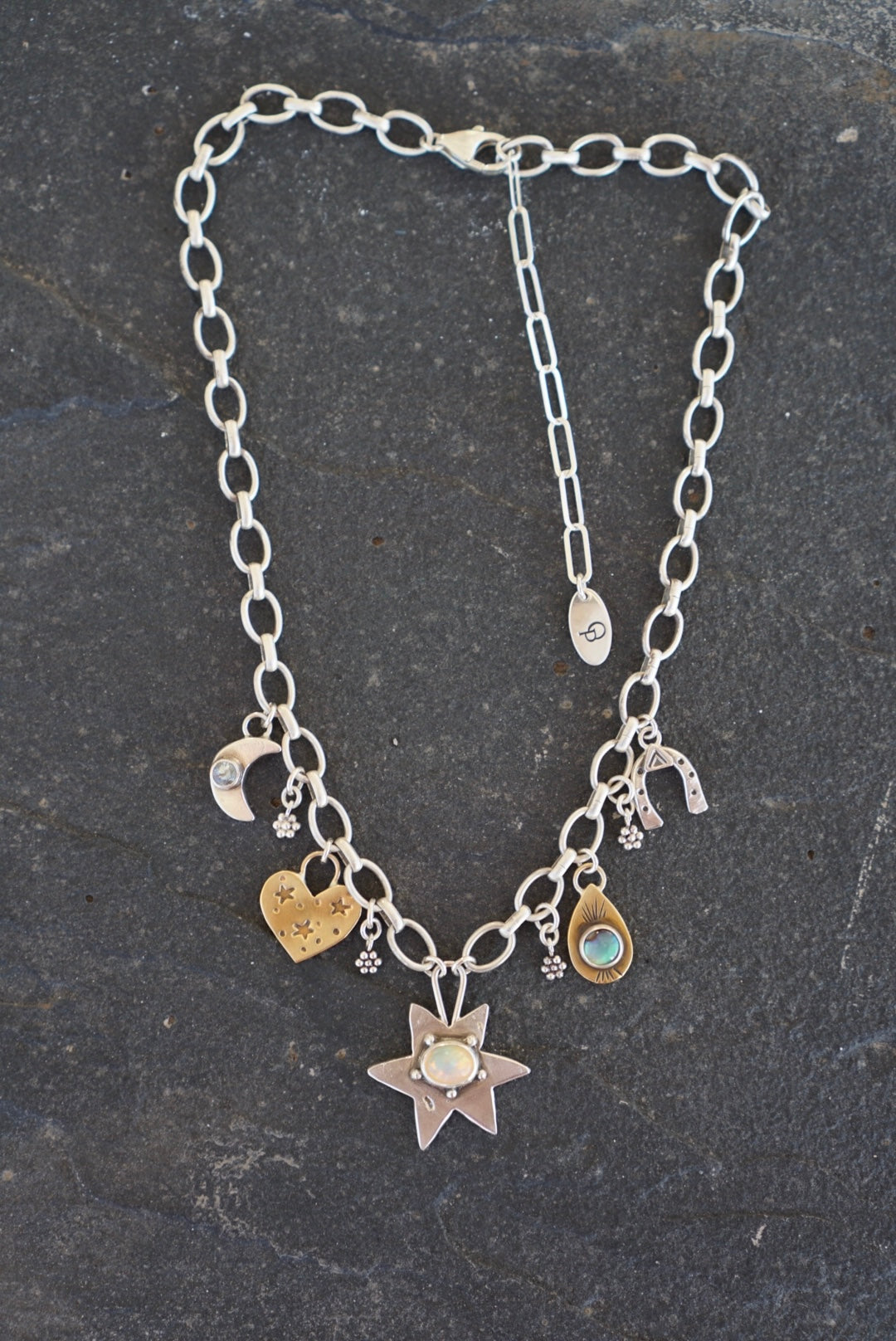 This necklace was a labor of love and is truly one of my most favorite things I've created. Each charm is made from reclaimed silver that I processed myself by melting down scrap silver and rolling out into thick sheet, or with extra thick jewelers brass. I then forged and sawed each charm, adding gemstones, accents and hand stamped details. This necklace features a horseshoe charm, with a little stamped accent, a teardrop charm with an iridescent Abalone gemstone, an abstract Star charm with a gorgeous Ethiopian Opal in the center, a heart charm with with celestial stamping, and a crescent moon charm with a stunning brilliant cut light blue Montana Sapphire. Tiny little flower charms dangle in between each larger charm and they all dangle on a hefty vintage sterling silver chain that I sourced. The chain measures 15 inches in length and has a 2 inch extender allowing for adjustment up to 17 inches in length. Necklace is finished with a sterling silver lobster clasp.
