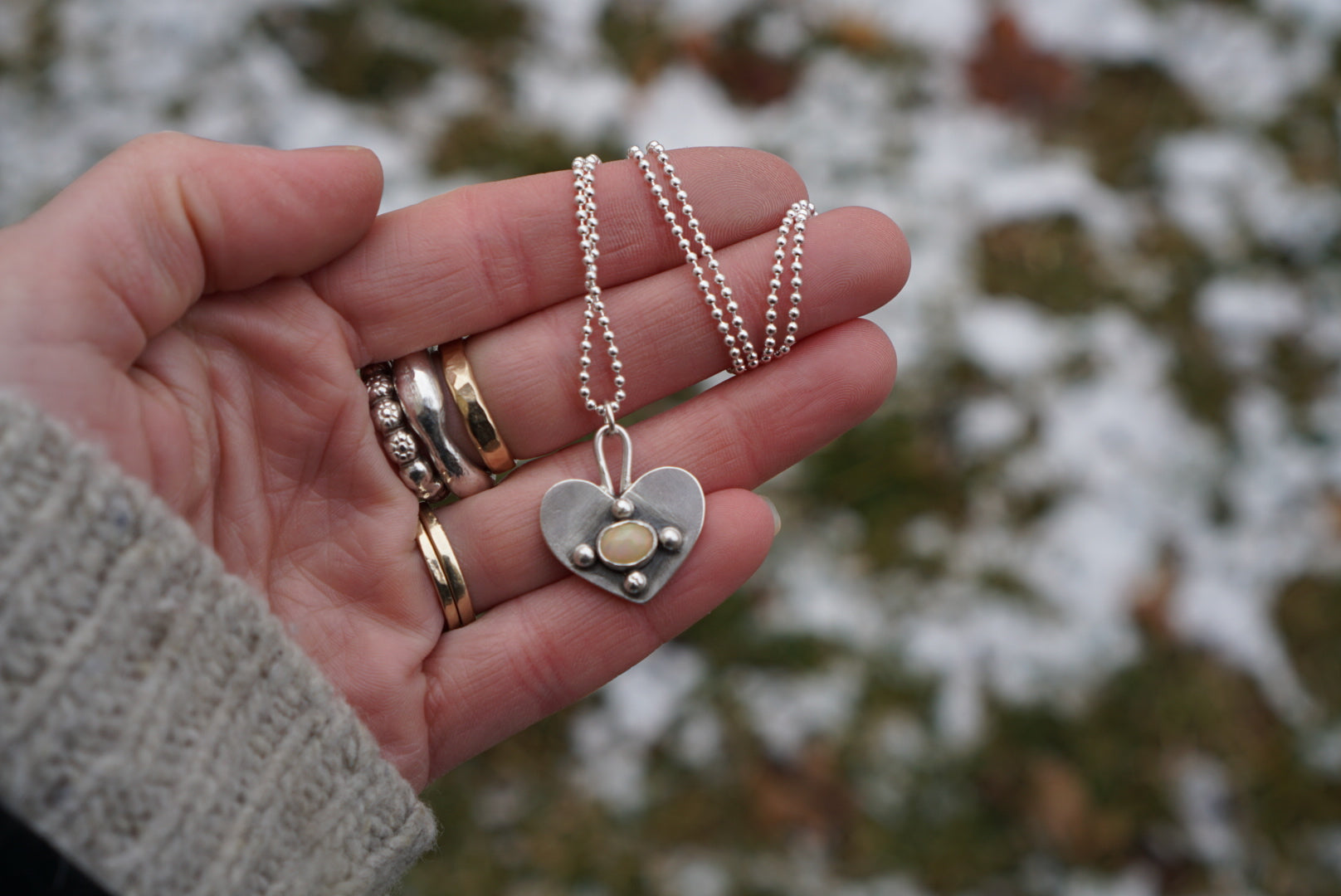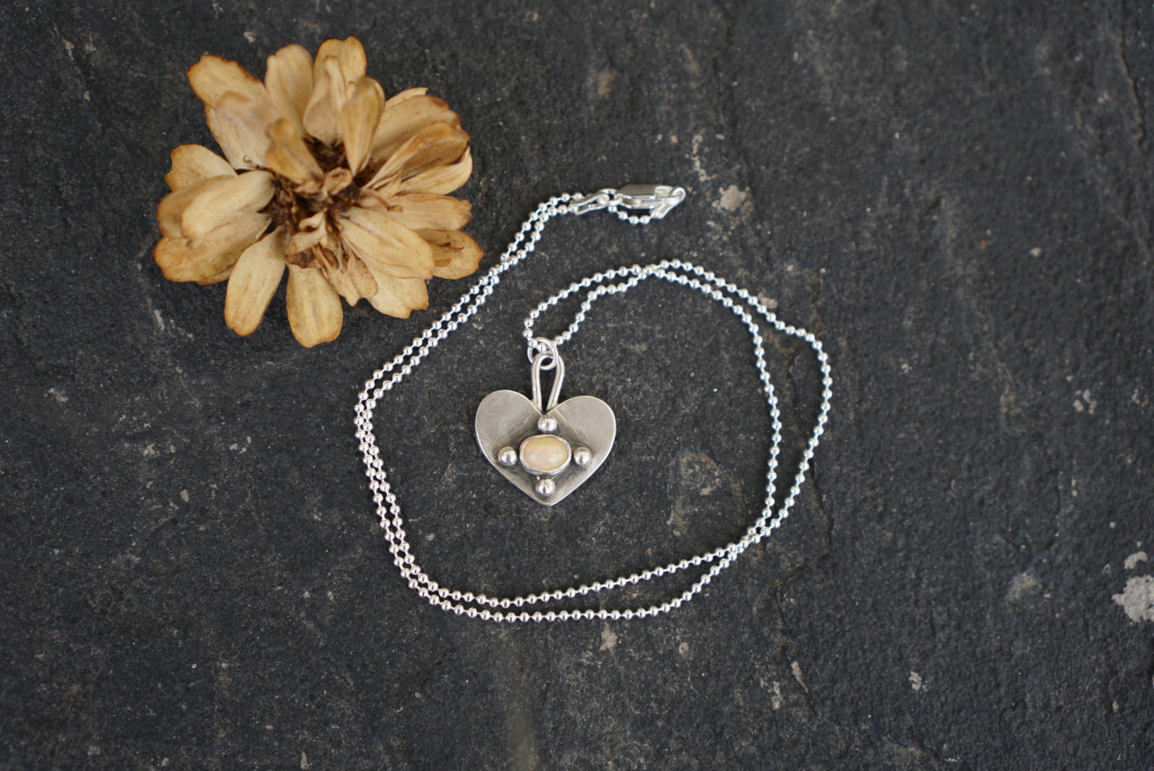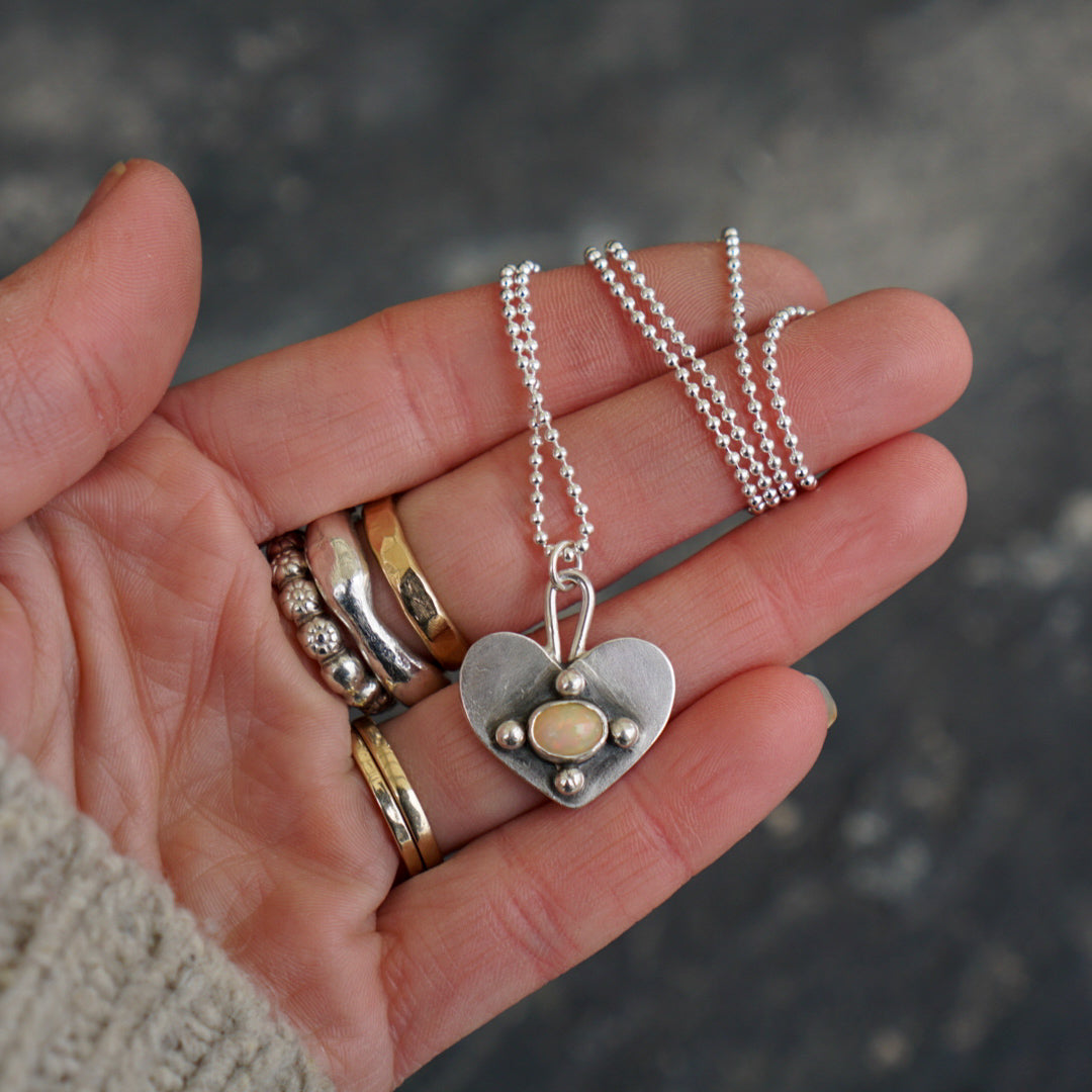 Made with reclaimed silver by me, this gorgeous pendant necklace features a thick hand sawed heart charm with a flashy little Ethiopian Opal in the center with sterling silver ball details. Pendant hangs from an 18 inch sterling silver ball chain.