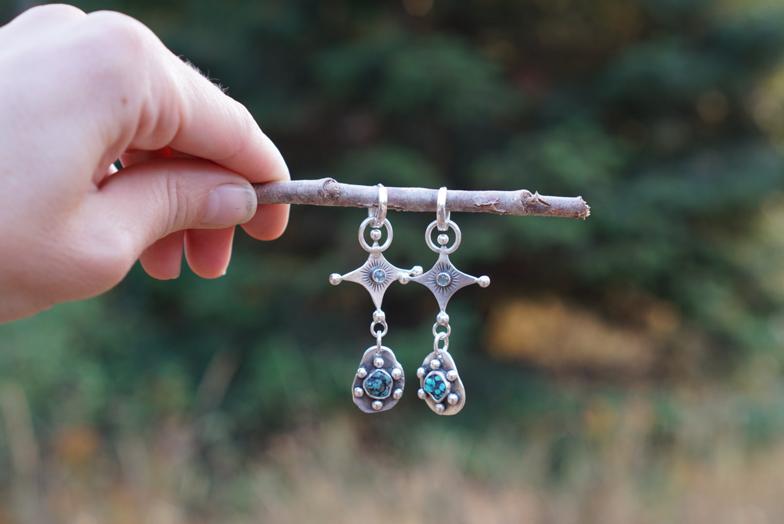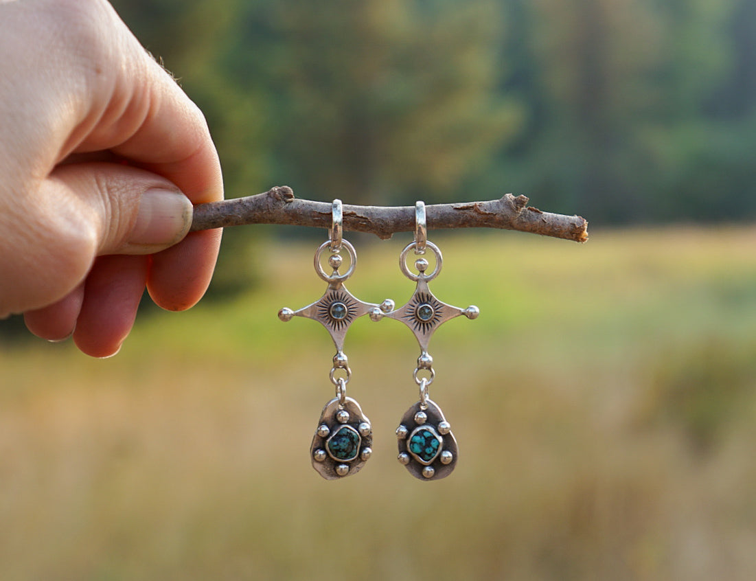 These unique Huggies have a bit of an old world vibe to them. They feature organic shaped pressed sterling charms with sterling silver ball and Alacron nugget Turquoise that dangling below 4 point stars with little rose cut Montana Sapphires in the center with sunburst detail along the stones. These hang from lever style sterling silver huggie hoops and measure about 2.25 inches long.