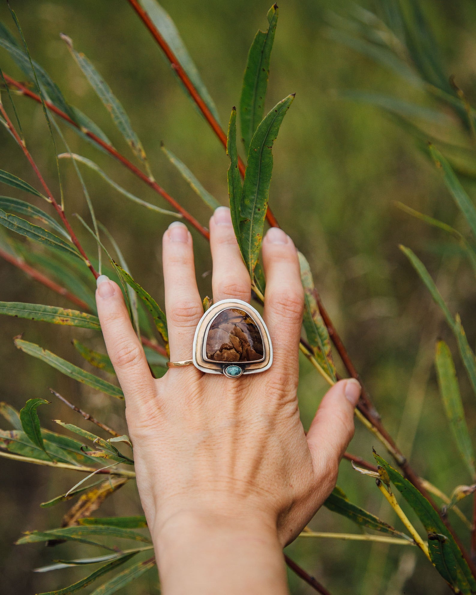 This gorgeous hefty ring features a thick hunk of beautiful Deschutes Jasper set atop a sturdy layer of 14k Goldfill and a another sturdy layer of genuine Sterling Silver. Nestled below is little piece of American mined turquoise. Oxidized and polished for a warm rustic finish. The band is wide and made with extra thick sterling silver for weight and comfort. Band is heavily textured for added detail and measures a size 7.5.