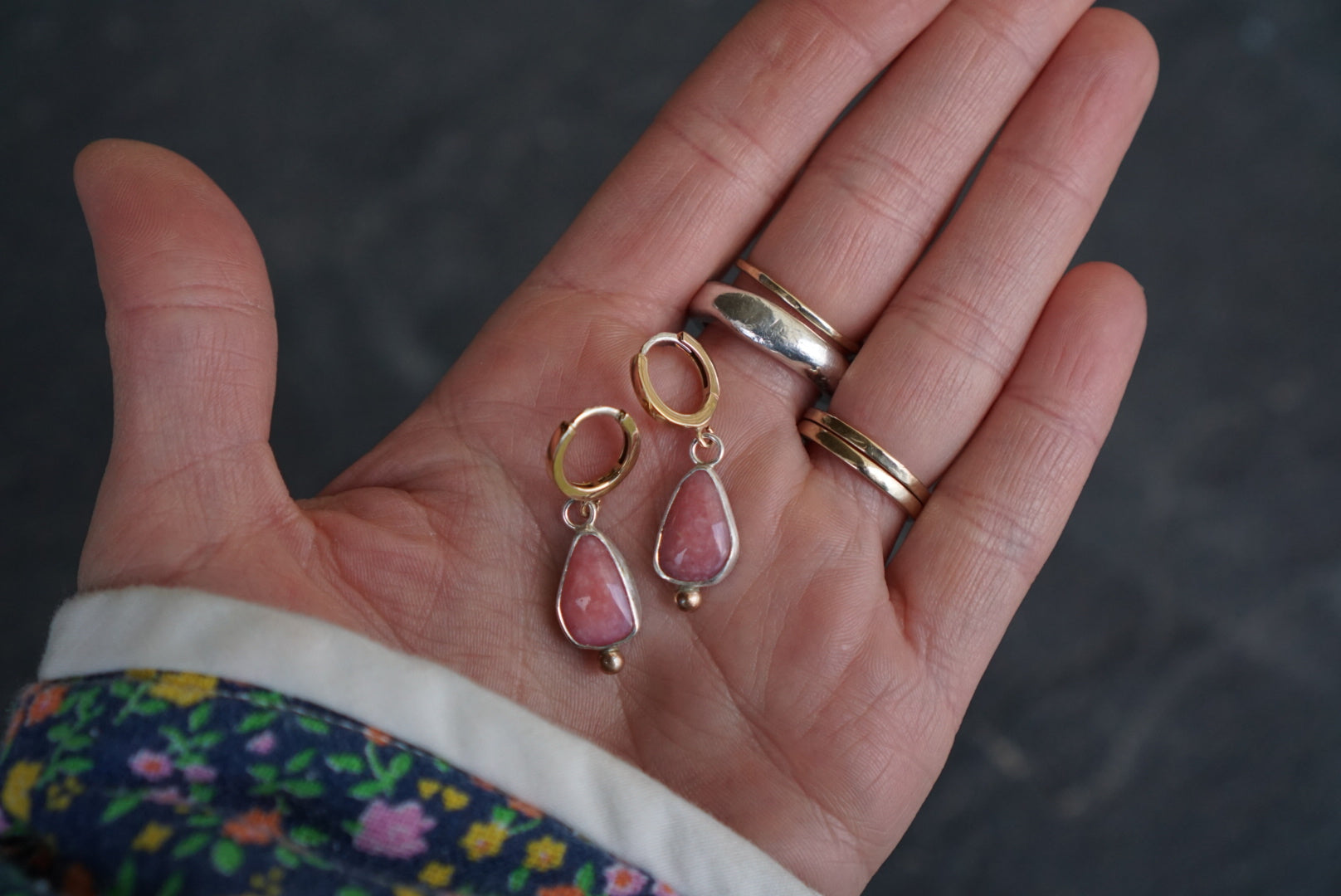 The cutest little lever back, jewelers brass huggie hoop earrings with sterling silver hypoallegenic ear posts that feature beautiful teeny tiny slices of Pink Opal that are wrapped in sterling silver with little brass ball detail below. This is the best of everyday jewelry goodness! These measure around 1 inch long.