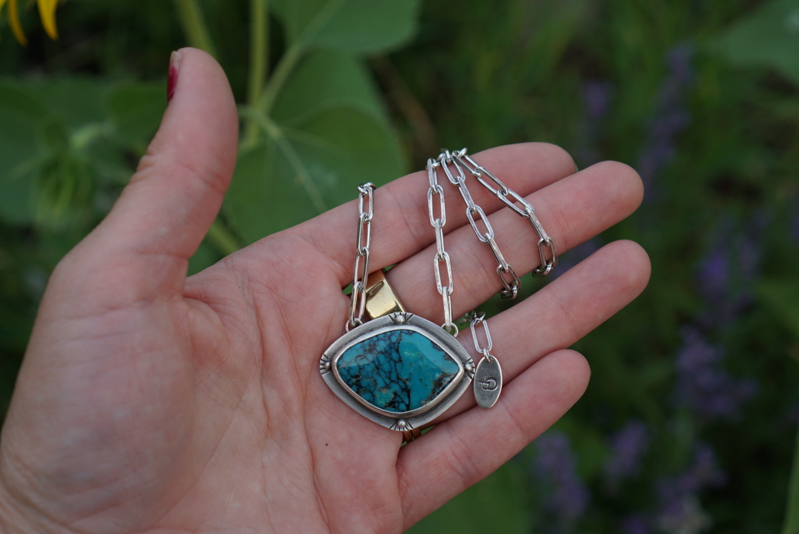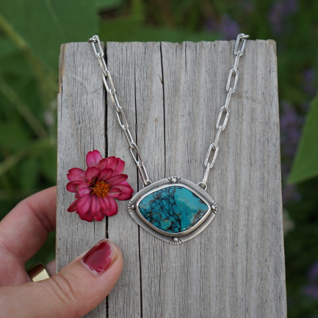 This lovely necklace is made with a deeply colored Turquoise stone wrapped in silver with hand stamped and silver ball details. This pendant hangs between a thick and sturdy paperclip silver chain and is finished with a lobster clasp and extender for adjusting length. Necklace measures 16 inches long and can be clipped to any link on the adjuster up to 19 inches.