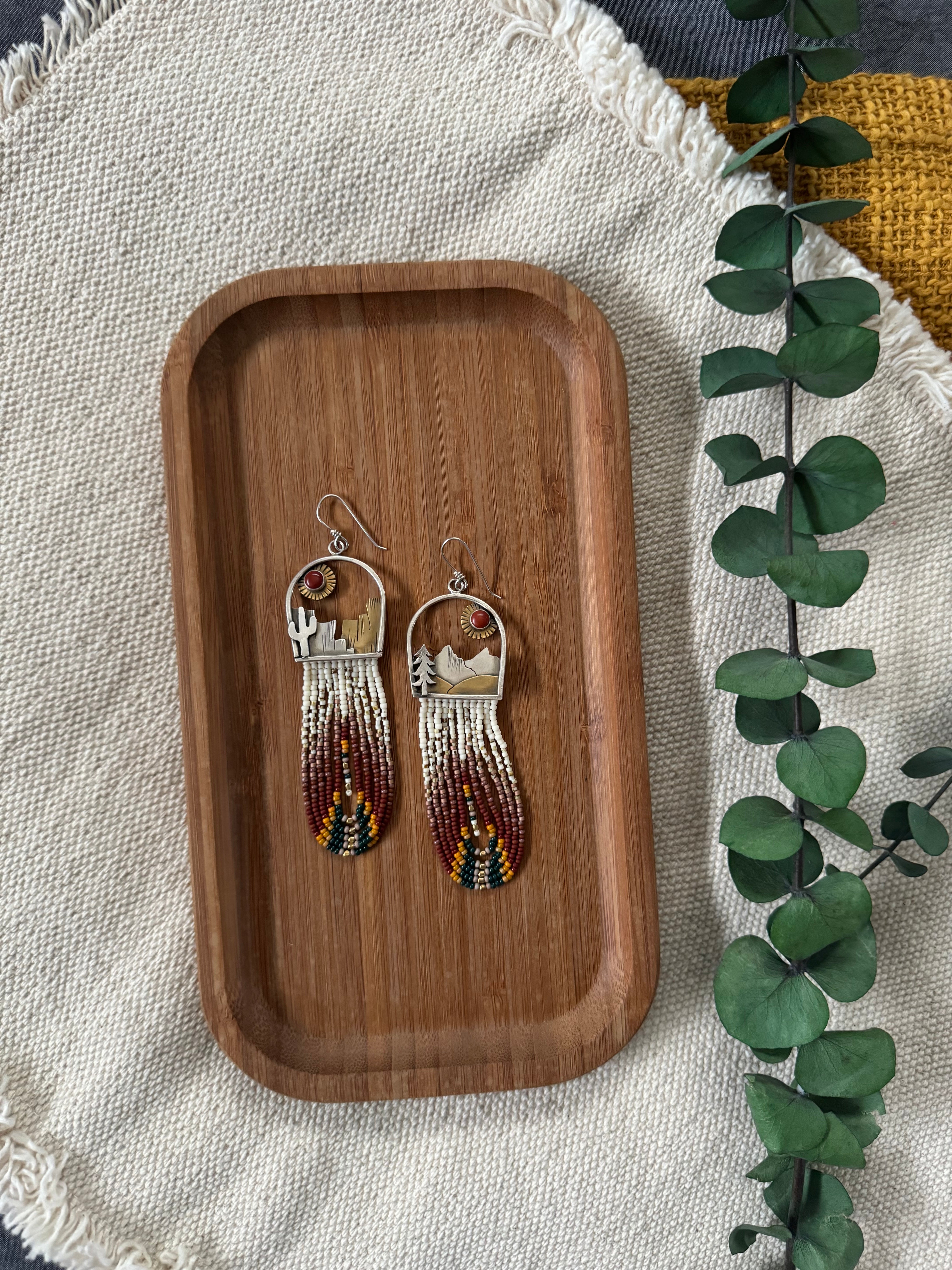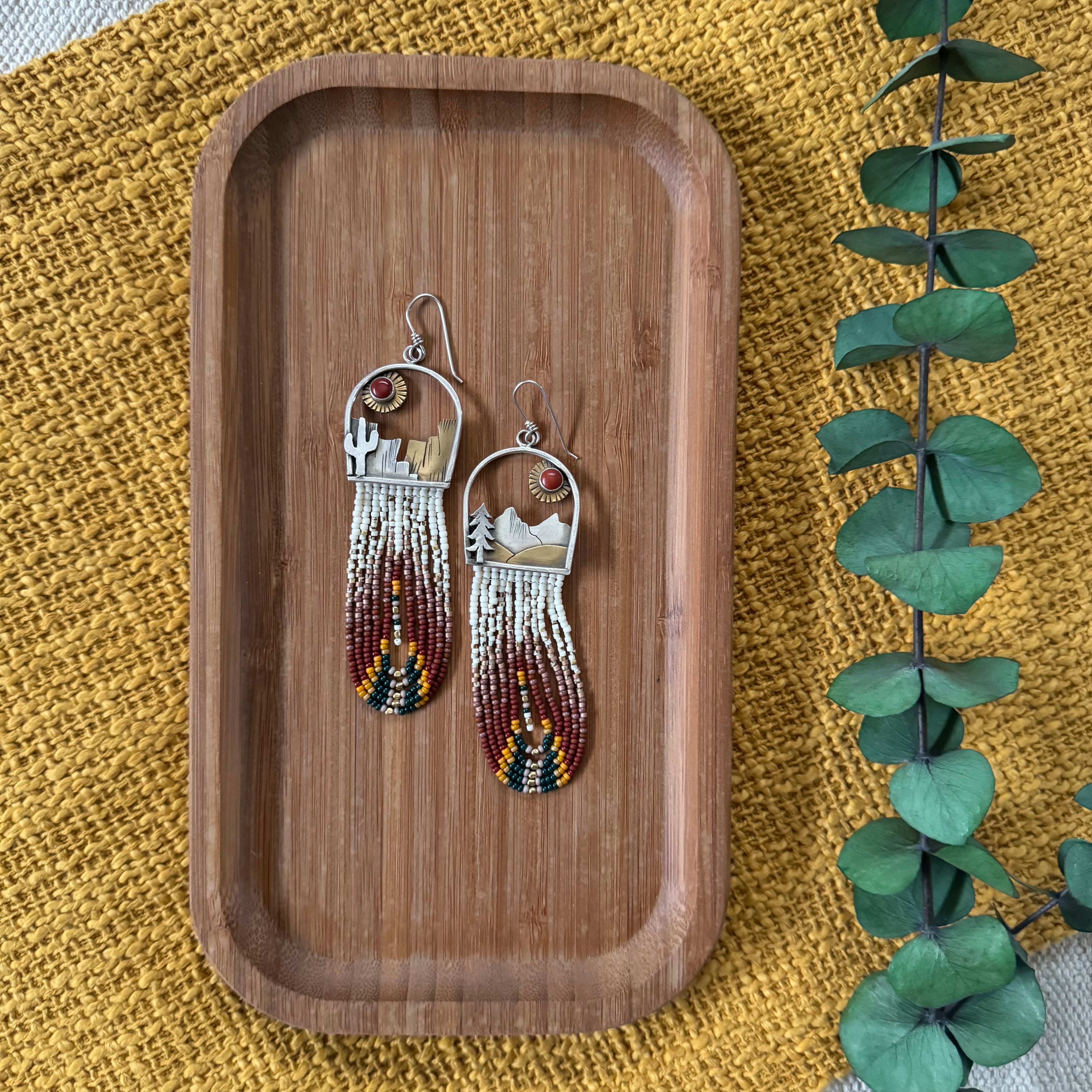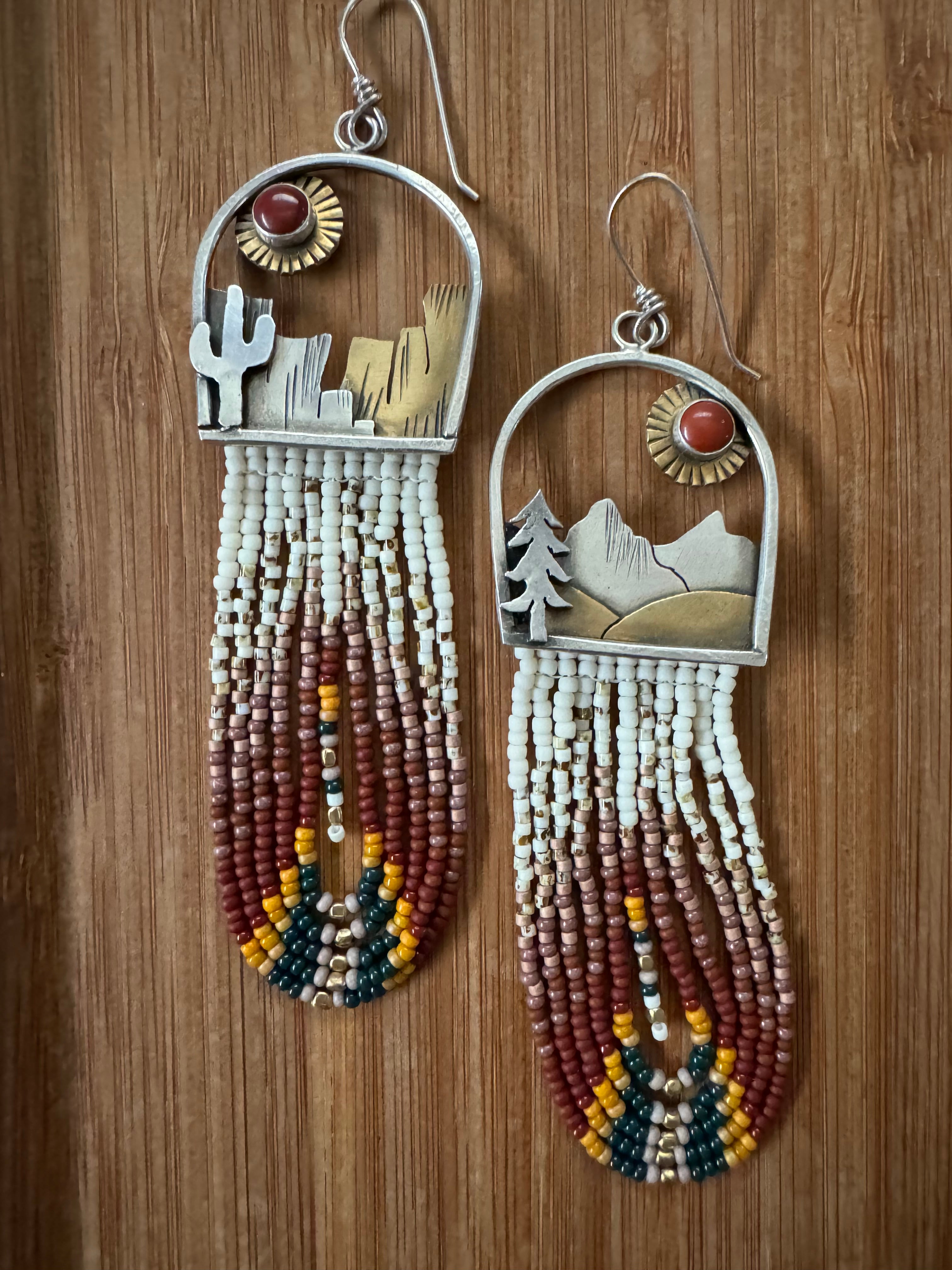 An extraordinary collaboration between Miko Japanese Beads and O&P Metalworks. Beautiful earrings featuring gorgeous little scenes in metal; one of a desert landscape and the other a mountain landscape, each with a little red jasper sun and intricate hand beaded fringe dangling below. Earrings are completely handmade and dangle from handmade sterling silver earwires. Earrings measure about 4.5 inches in length.