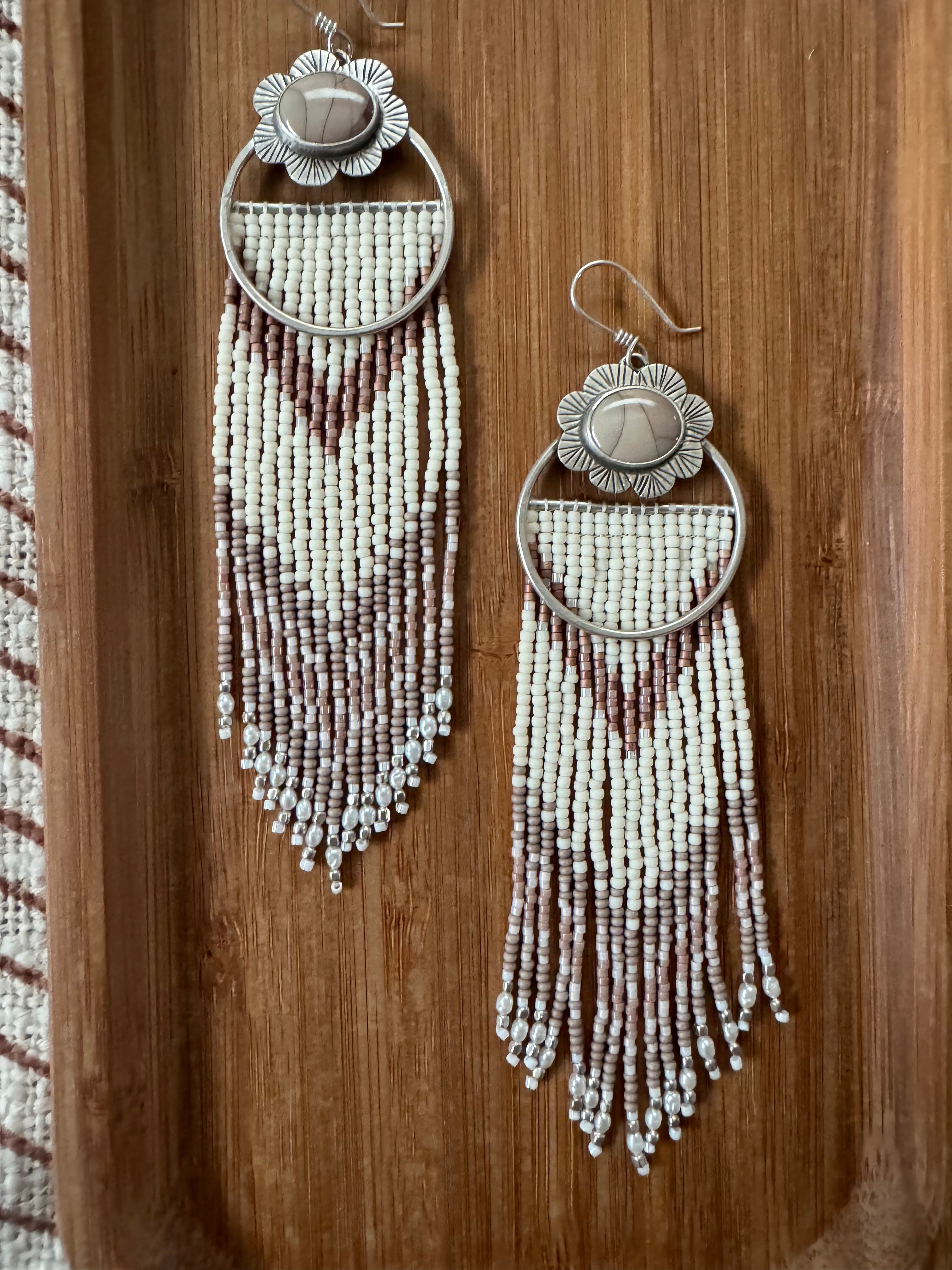 An extraordinary collaboration between Miko Japanese Beads and O&P Metalworks. Beautiful earrings featuring gorgeous pink and gray Willow Creek Jasper gemstones set in sterling silver with handstamping and scalloped edges and intricate hand beaded fringe dangling below. Earrings are completely handmade and dangle from handmade sterling silver earwires. Earrings measure about 5.5 inches in length.
