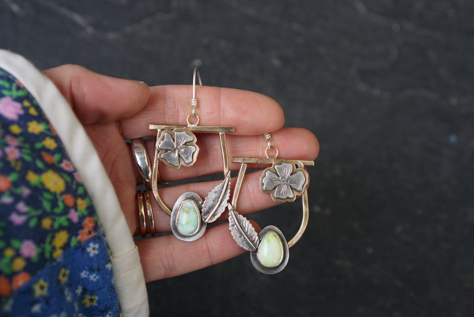 Gorgeous earrings featuring completely handmade stirrup style hoops with hand sawed and textured flower and leaf details and stunning light green Palomino Variscite gemstones nestled in sterling silver perched at the bottom of the stirrups. These earrings have nice movement and are oxidized and polished to accent the details. These measure 2.5 inches long and hang from hand crafted sterling silver earwires.