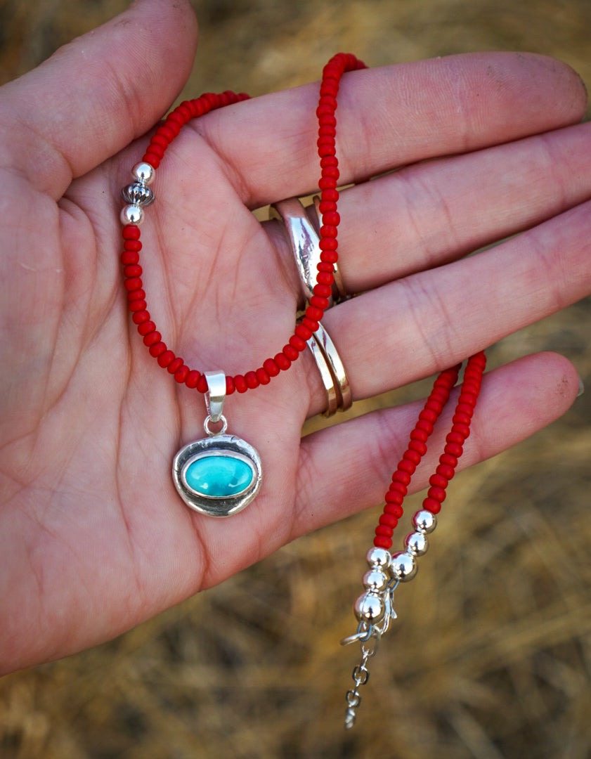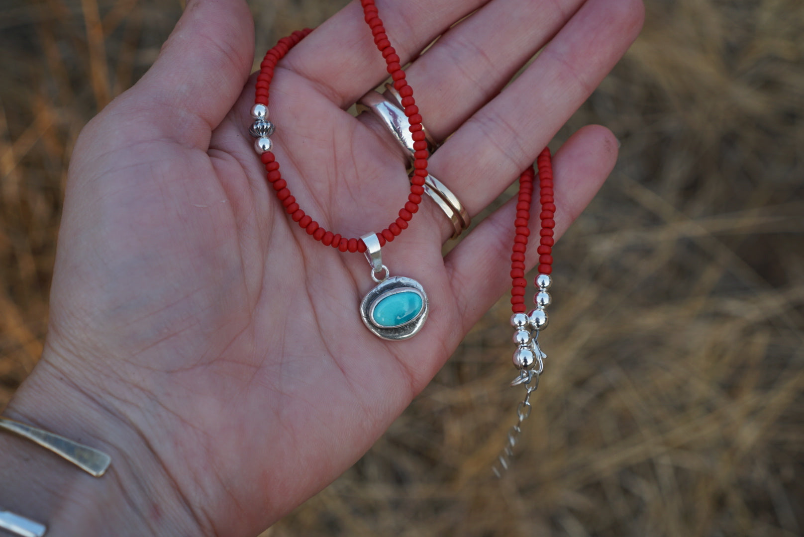 This beautiful pendant necklace features pressed silver pendant with turquoise and is strung on a hand beaded strand of red seed beads with an off center silver bead detail one side. This beautiful necklace measures 16 inches long with a sterling silver extender chain for adjusting up to 18.25 inches long and finished with a sterling lobster clasp.