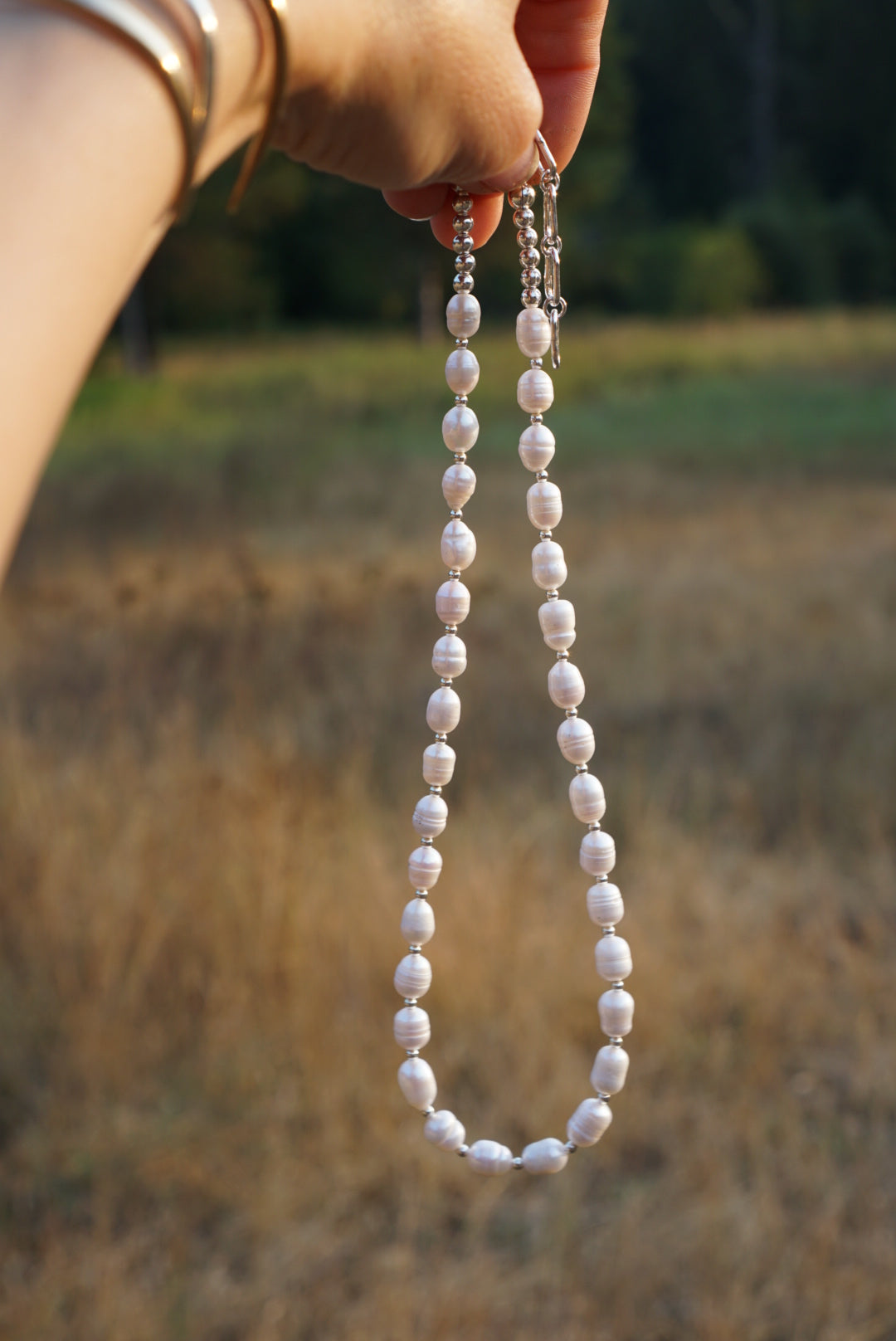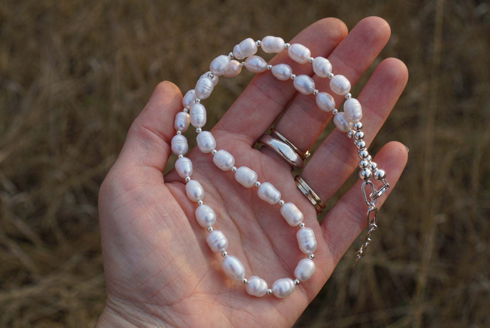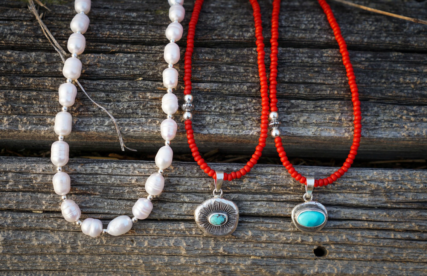 A beautiful strand of white Freshwater Pearls with sterling silver spacers between each pearl. Finished with sterling silver bead accents, lobster clasp and handmade extender. This necklace is perfect for wearing alone or layered with other necklaces. Measures 17 inches long with adjusting extender up to 19 inches.