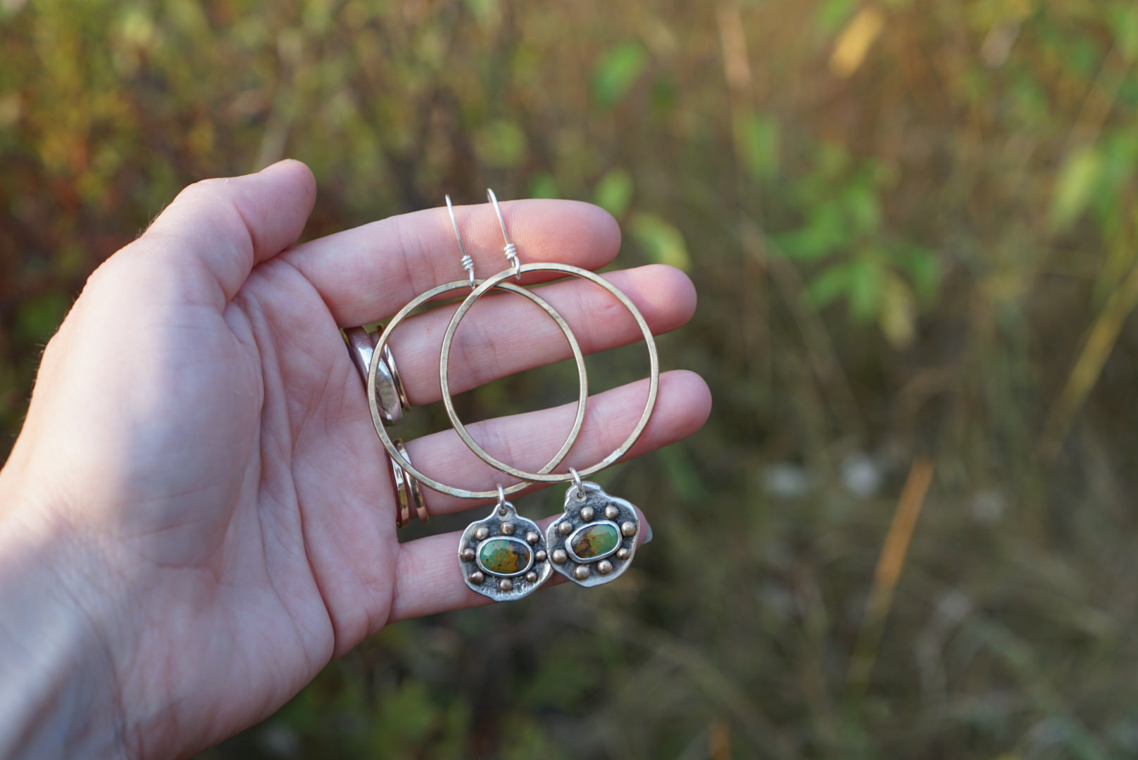 Stunning hoops featuring beautiful earthy green Turquoise stones set simply in pressed sterling silver ore with brass ball details around the stones and dangling below hand shaped brass hoops. Earrings dangle from hand crafted sterling silver ear wires and hang just over 3 inches in length.