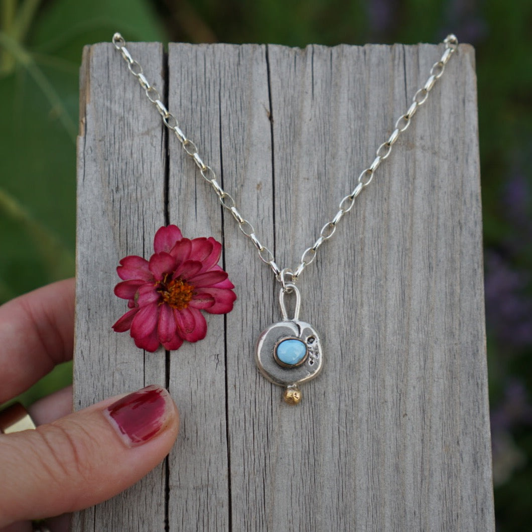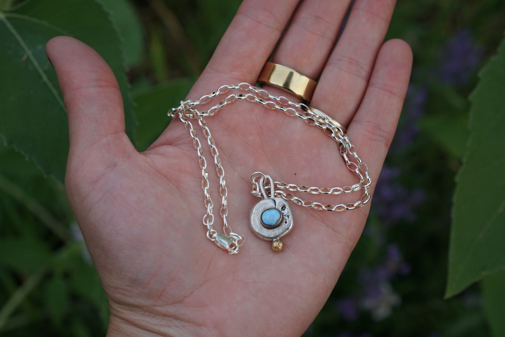 Little handmade and formed reclaimed nugget pendant of solid sterling silver with brass ball detail. Raw and rustic with a tiny little Golden Hills Lavender Turquoise gemstone nestled in a 14k gold fill bezel the center. This beautiful little pendant will hang from an 16 inch length sterling silver chain. Perfect for everyday!