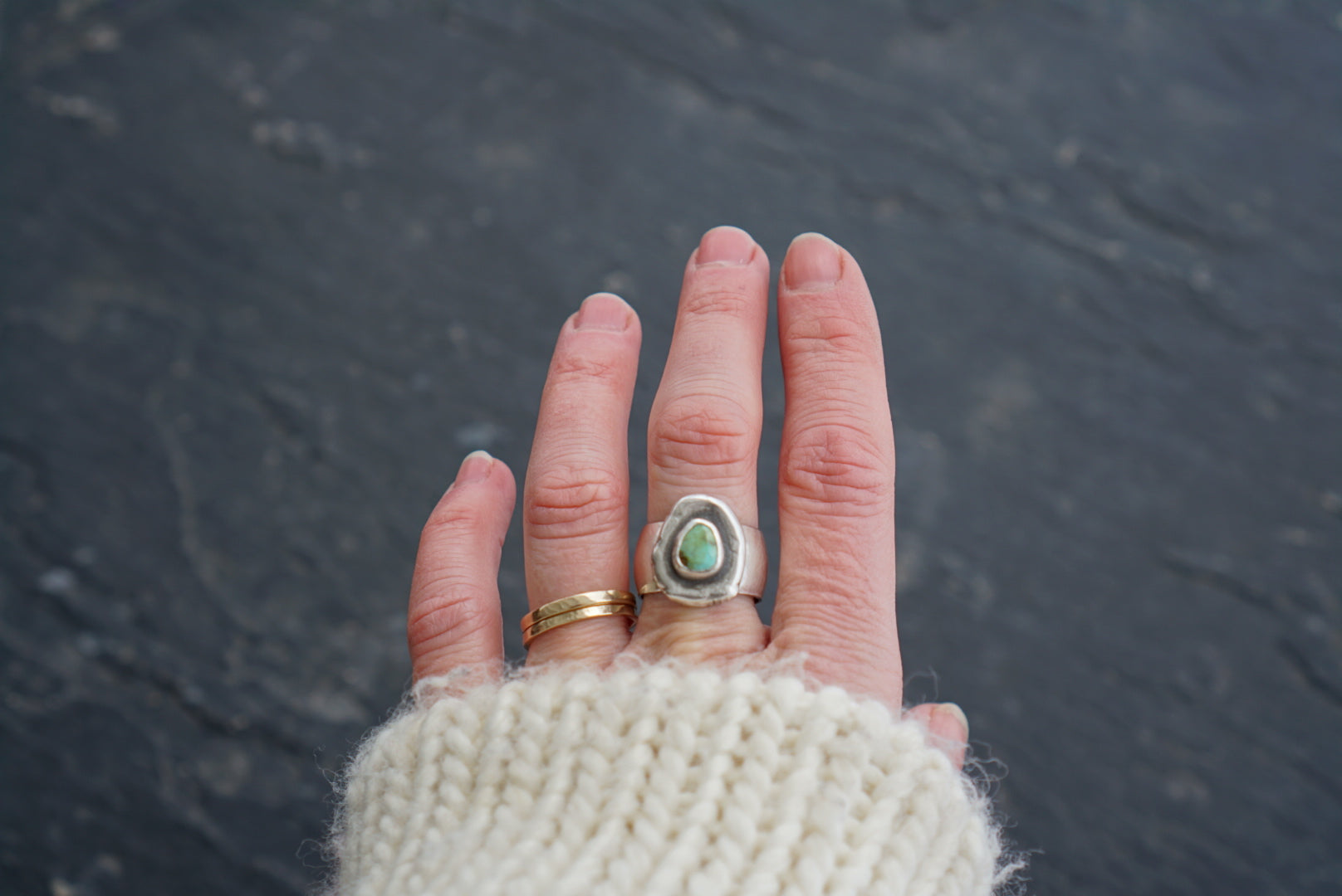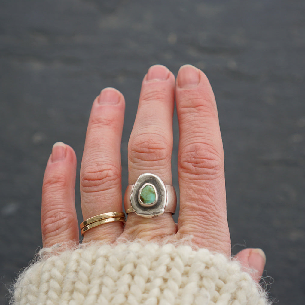 A pretty little slice of Sonoran Gold Turquoise is simply set in sterling silver and perched atop an organic shaped reclaimed and pressed sterling silver ore backplate. Ring band is a plain, wide, low dome band. Best fits a size 6.