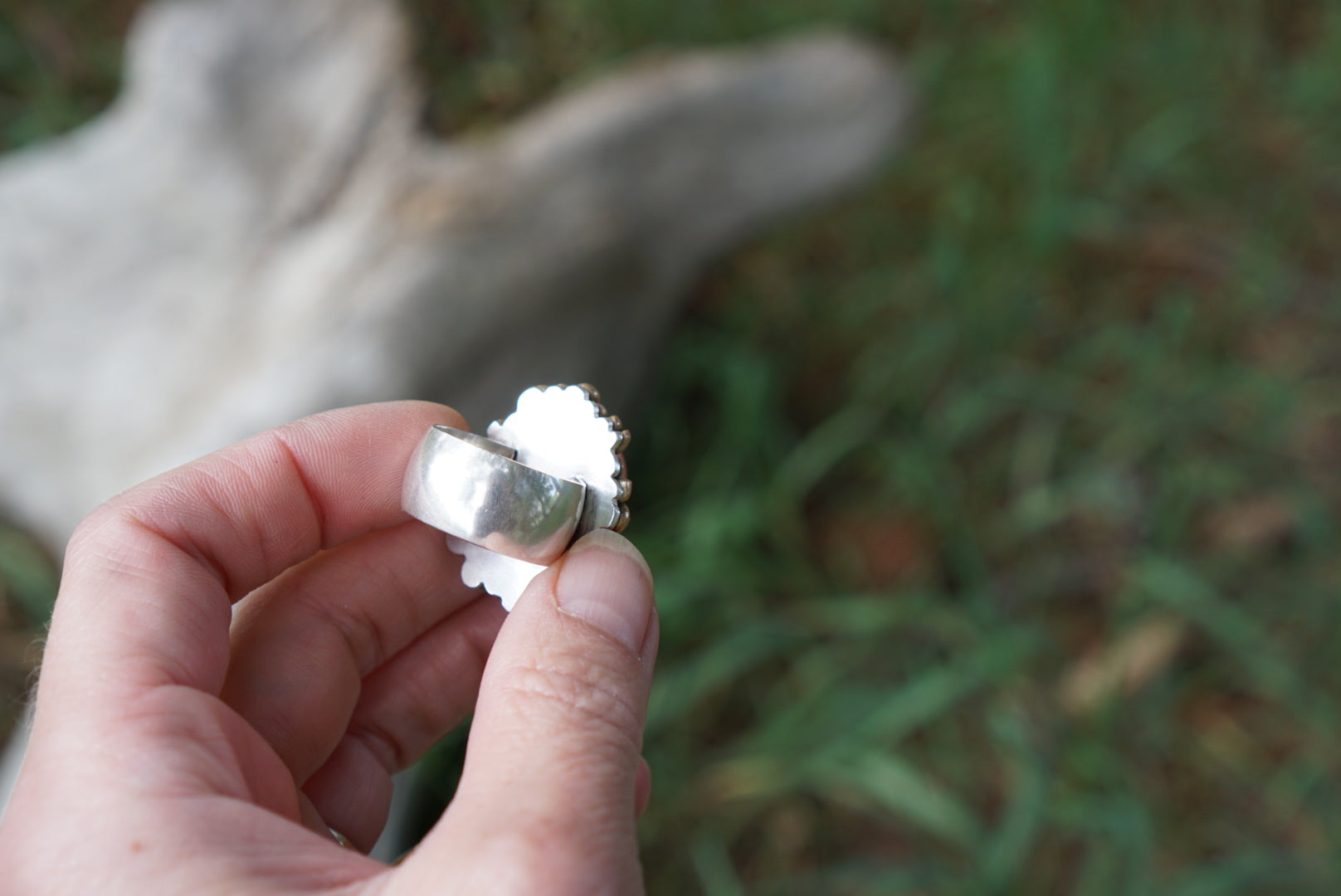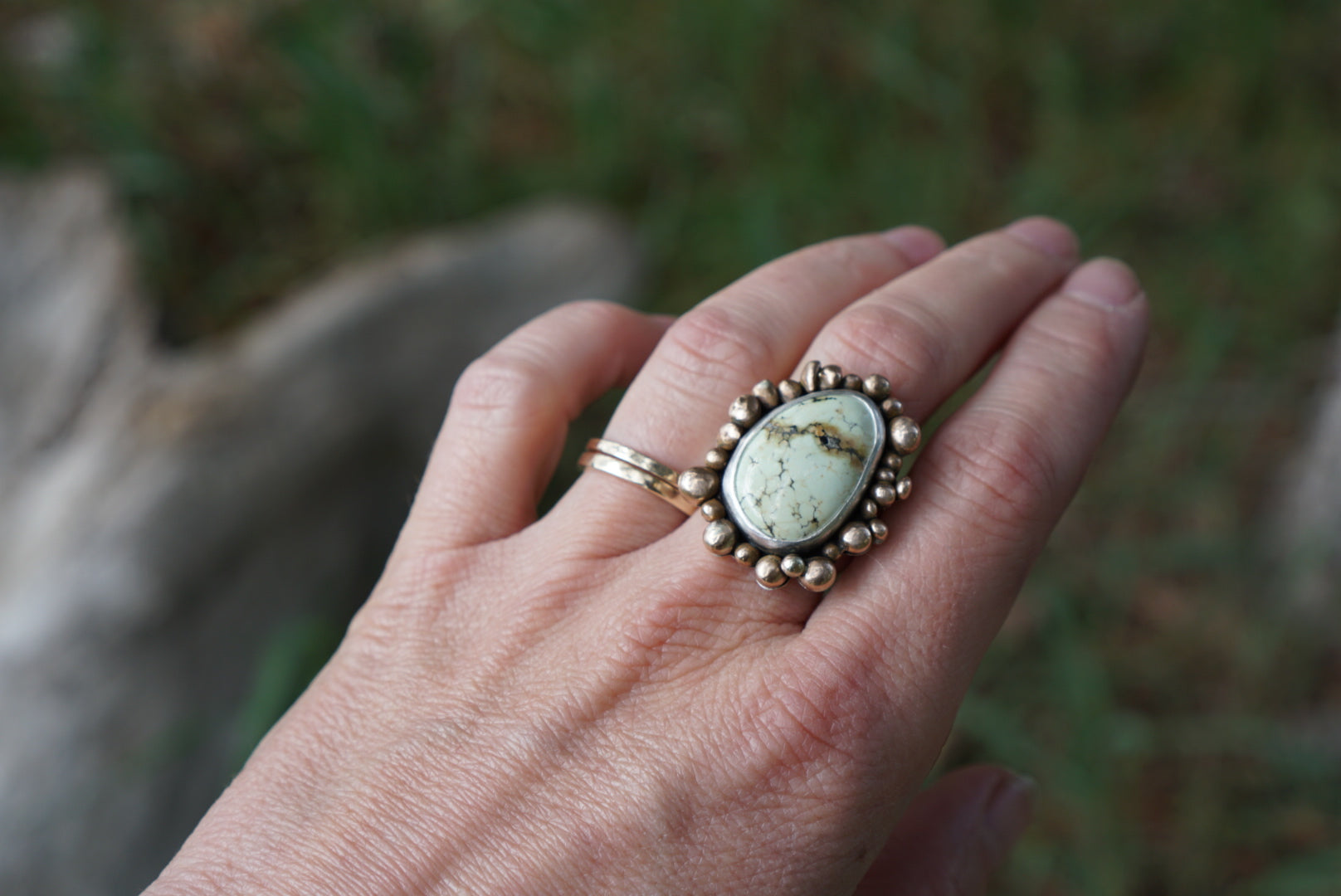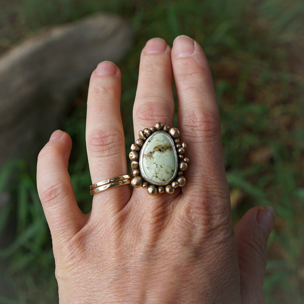 A chunky pale sage green Variscite stone is simply set in sterling silver with elaborate bronze ball bubble detail encircling the setting. Mixed metal perfection. Ring band is a plain and comfy, wide, low dome band. Best fits a size 7.