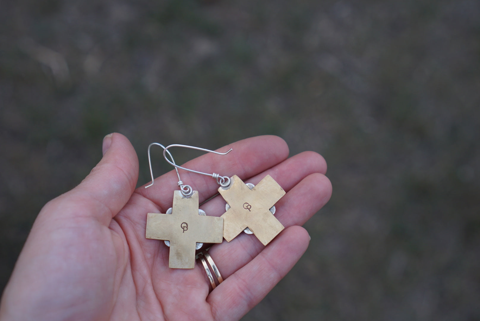 Rustic hand drawn and sawed brass plus signs feature hand stamped patchwork design encircling gorgeous turquoise stones. Finished with sterling silver ear wires and oxidized and softly polished for a rustic glow. Earrings measure about 2.25 inches long.