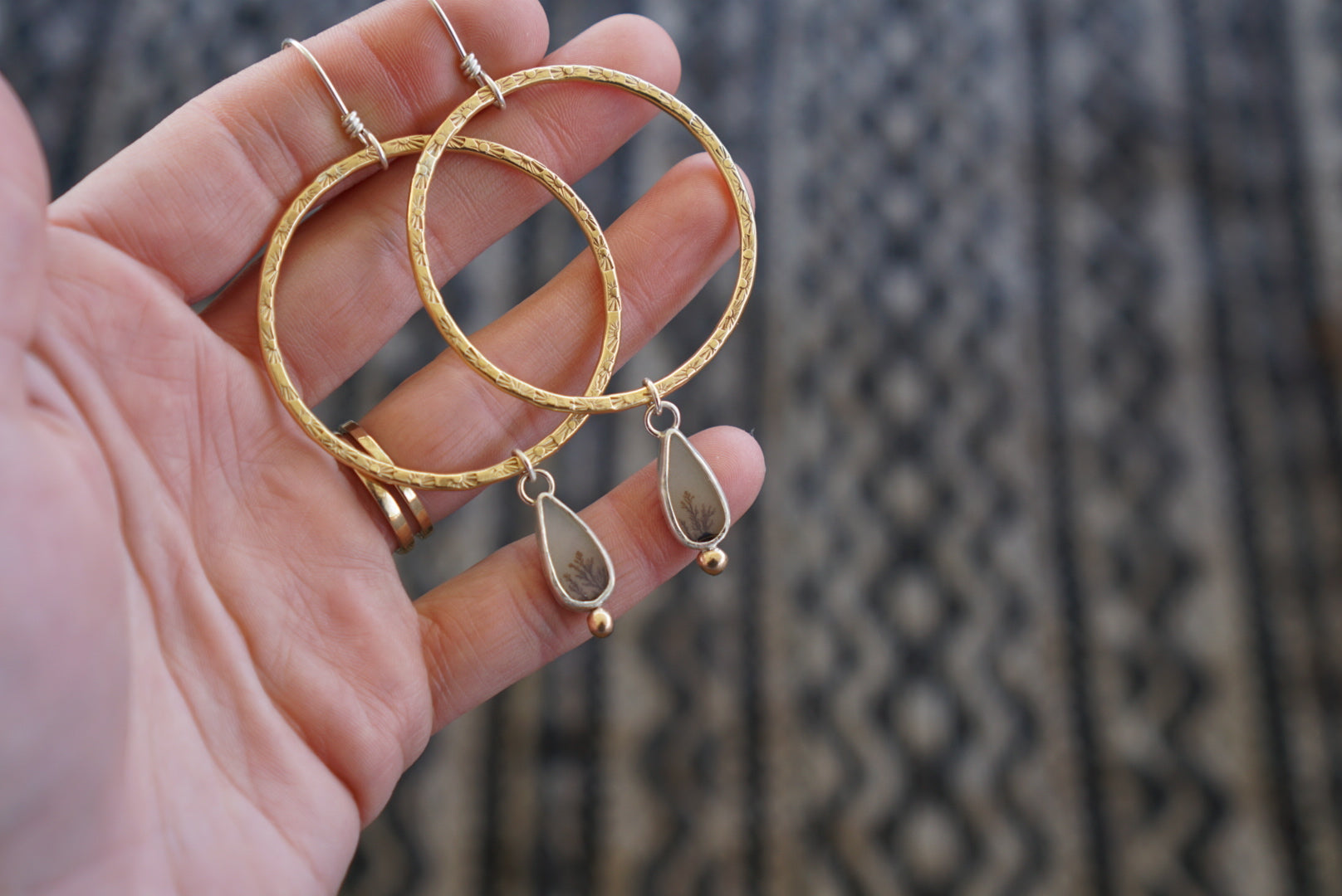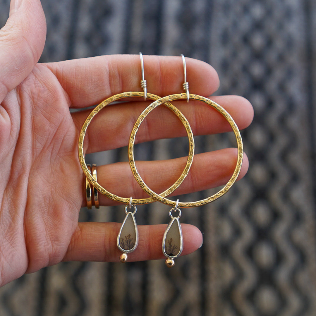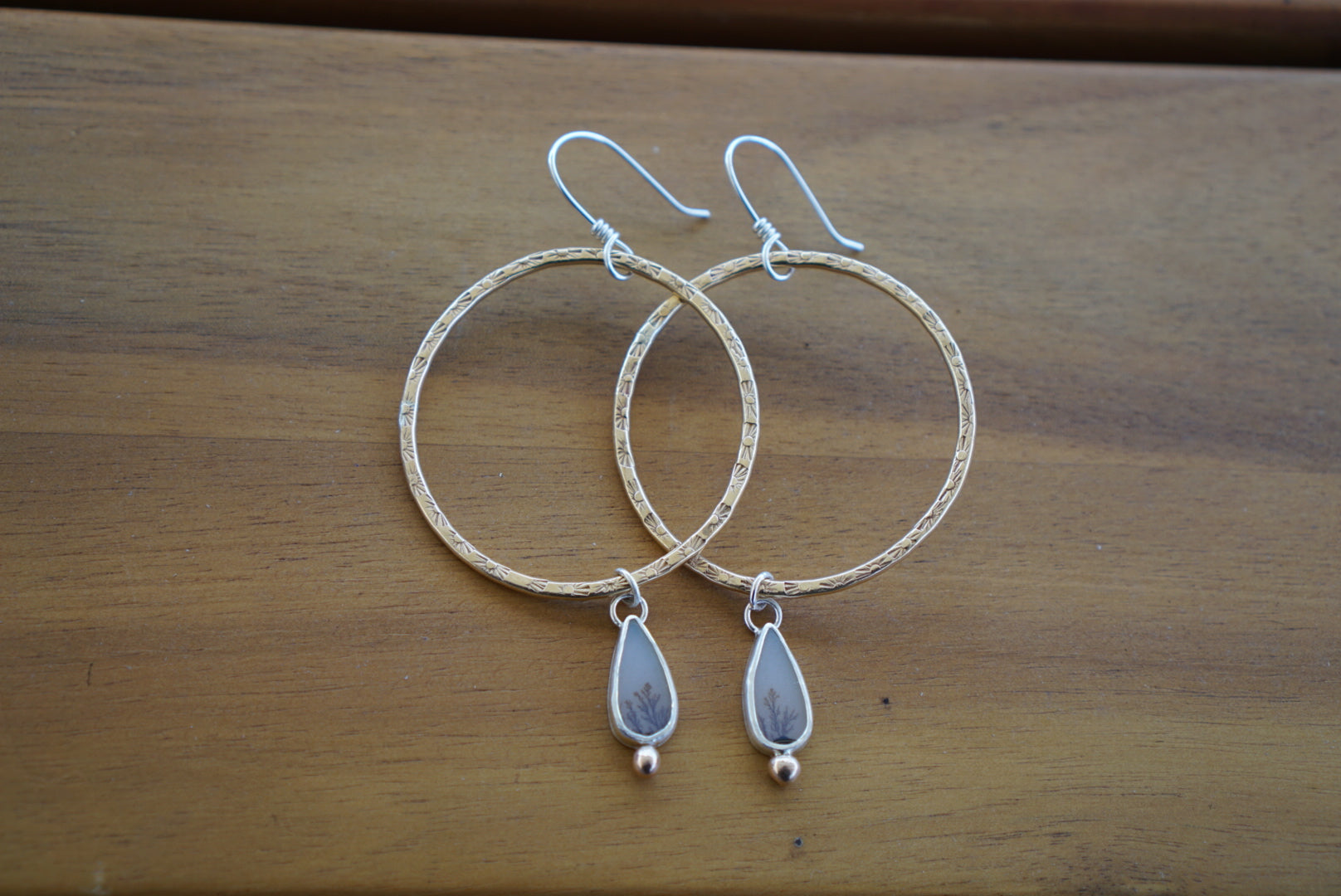 Beautiful medium sized everyday hoops featuring gorgeous earthy Dendritic Agate gemstones that look like little sagebrush scenes. Earrings are completely handmade from brass and sterling silver and dangle from handmade sterling silver earwires. Hoops measure about 1.25 inches in diameter and hang just about 3.25 inches long and are light and comfy for everyday wear.