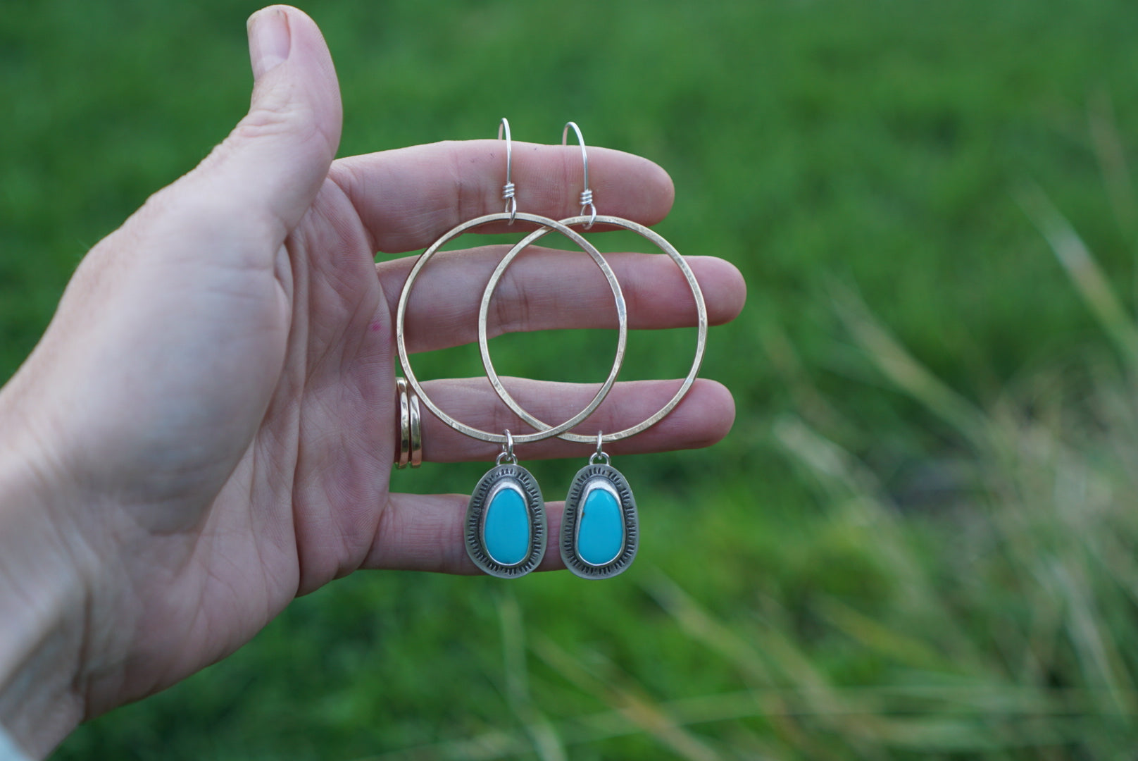 Beautiful medium size everyday hoops featuring gorgeous bright blue green Sonoran Gem Turquoise gemstones. Earrings are completely handmade from fine and sterling silver with golden brass hoops and dangle from handmade sterling silver earwires. Hoops measure about 1.75 inches in diameter and hang about 3.25 inches long and are extra light and comfy for everyday wear.