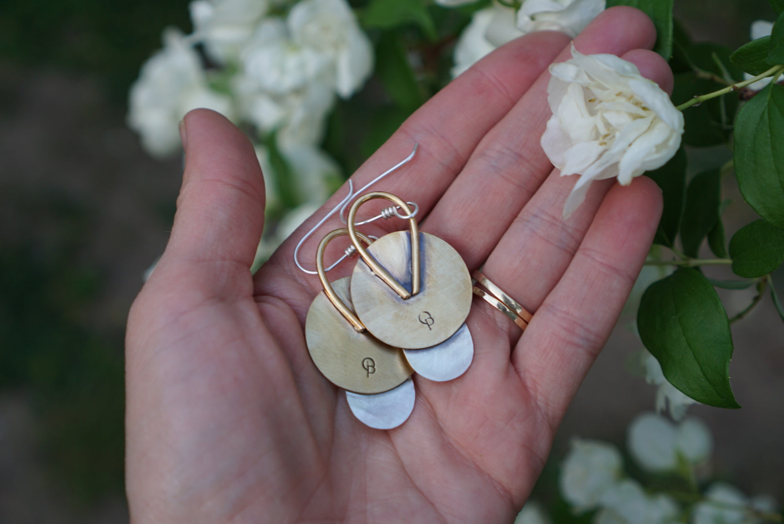 One of my all time favorite designs. This pair features beautiful Turquoise stones simply set in sterling silver and perched at the bottom of brass discs with hand stamped sunburst details. Brass loops crown the discs and dangle from handmade sterling silver earwires. Earrings dangle about 2.25 inches from the top of the earwire to the base of the stone. Brass is also subject to oxidation and will naturally darken with time. I love how brass looks as it ages, but if it’s not for you, polish on a regular basis to keep them shiny.