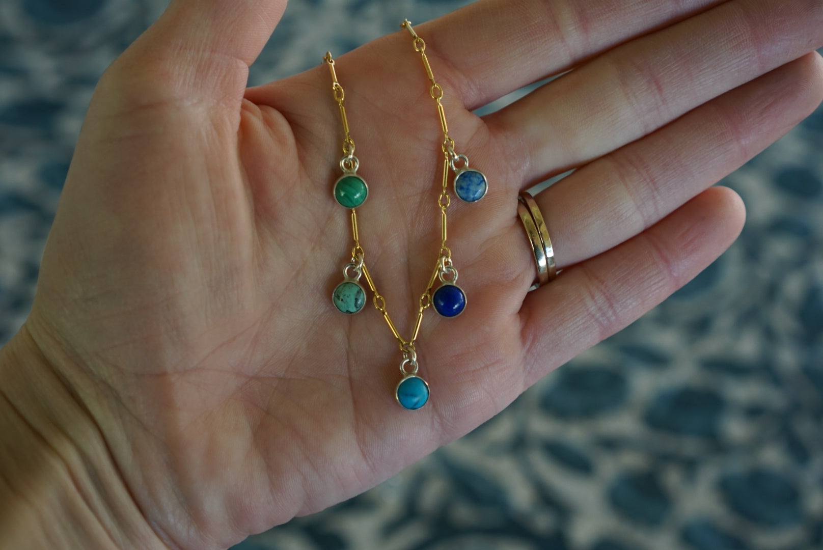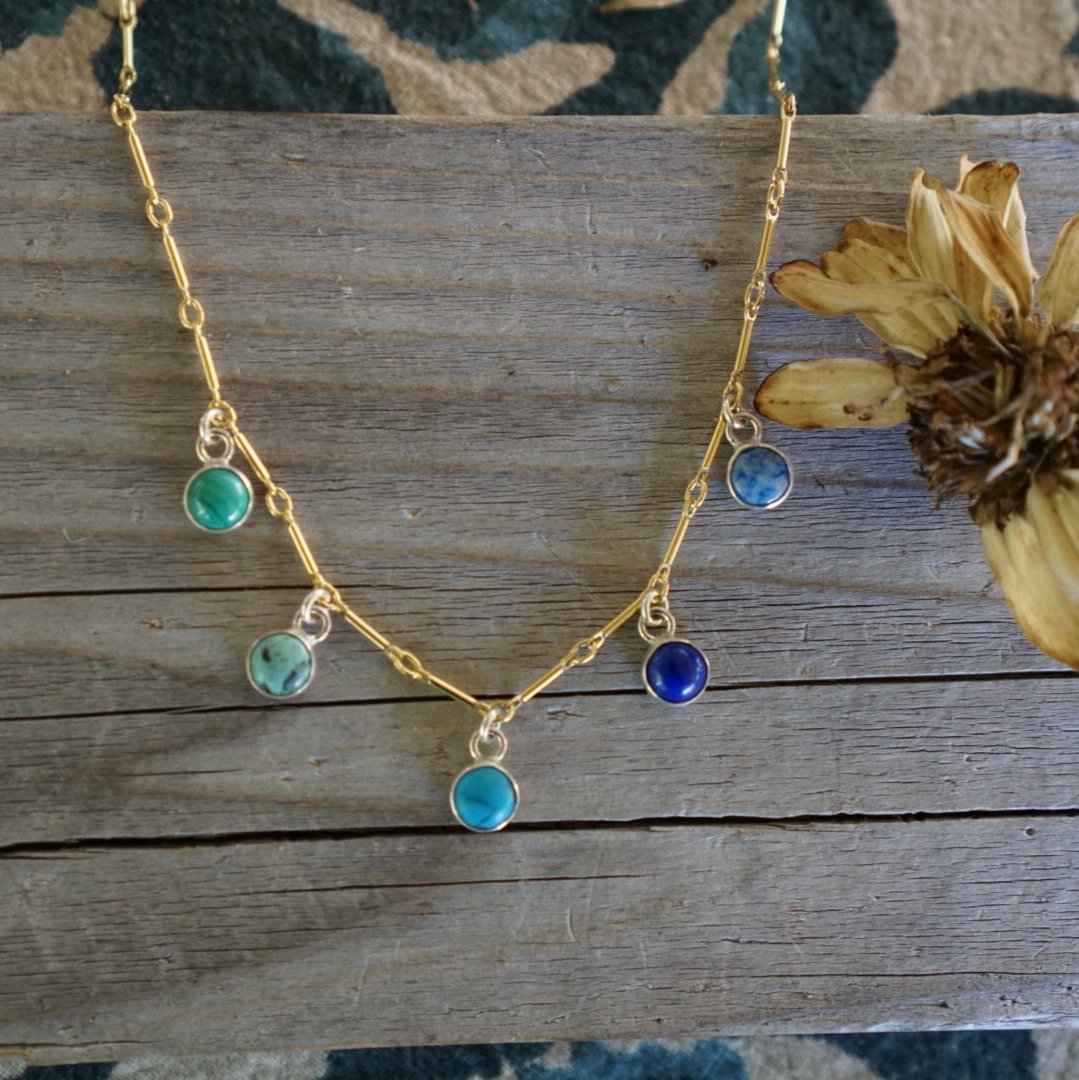 The sweetest little gemstone charm necklace. This beauty is amazing for layering and so cute with all the colors and different gemstones. Malachite, green Turquoise, blue Turquoise, Lapis Lazuli, and Sodalite all dripping from a 14k Goldfill bar chain. Necklace measures 15 inches long with a 2 inch extender for adjusting length up to 17 inches long.