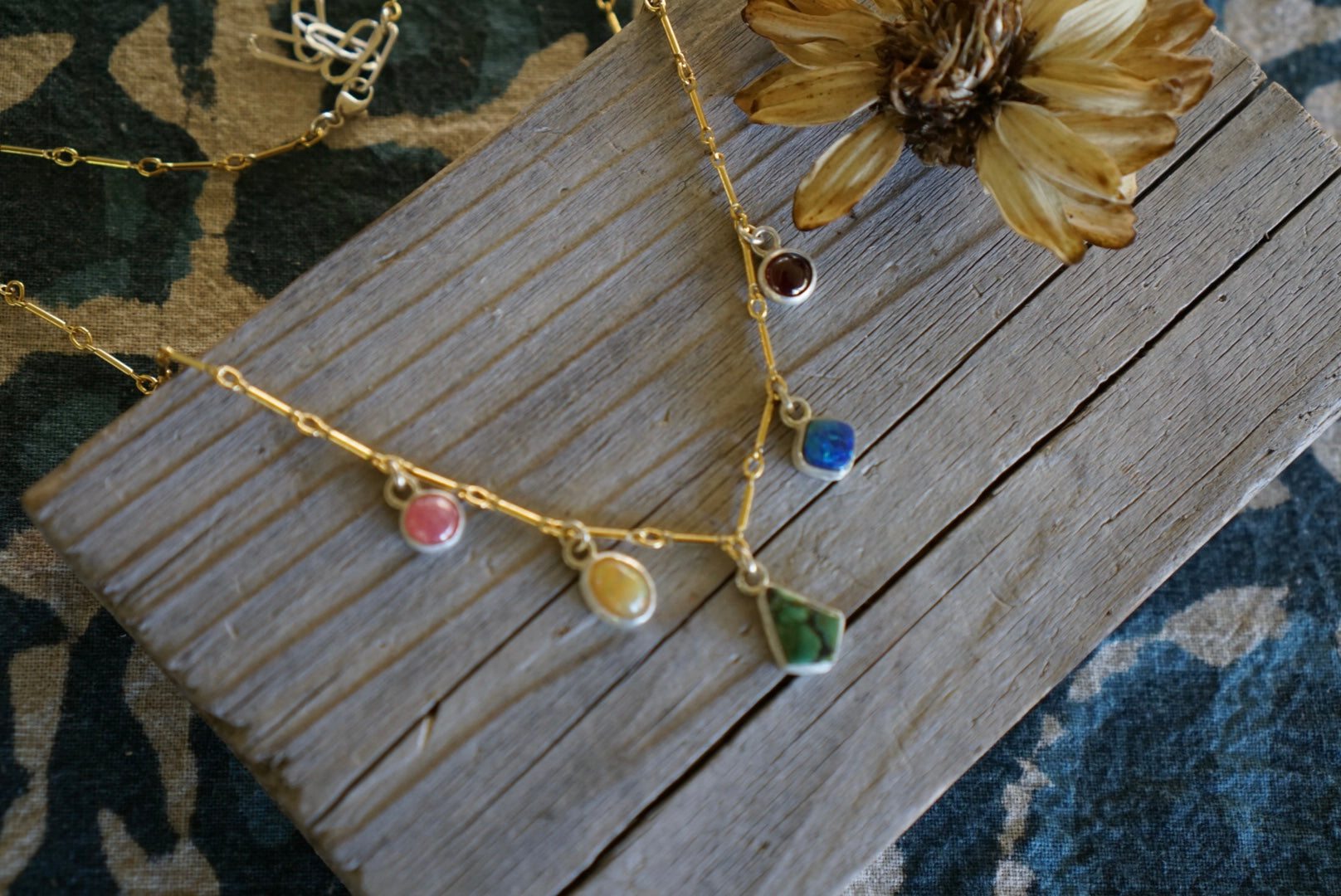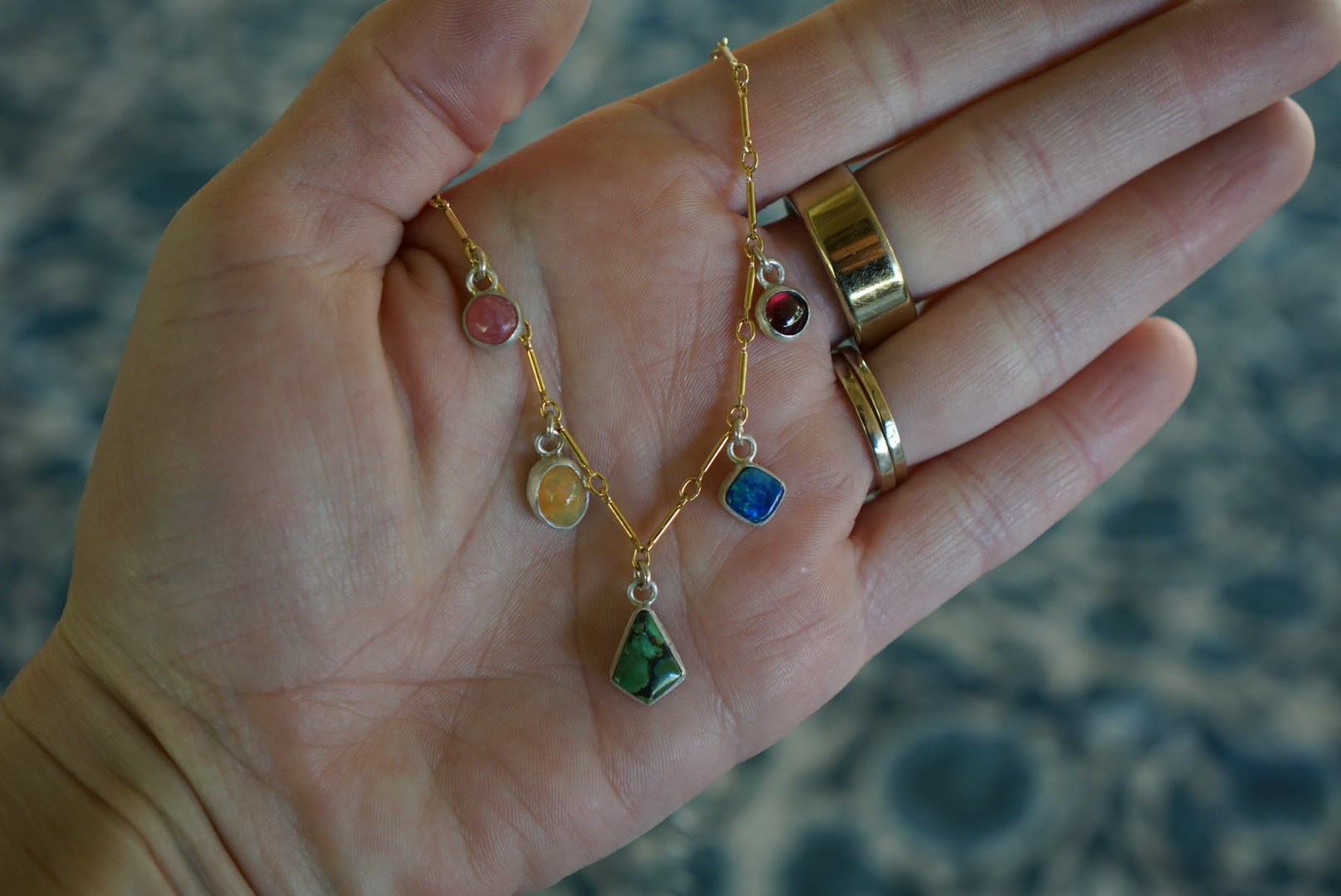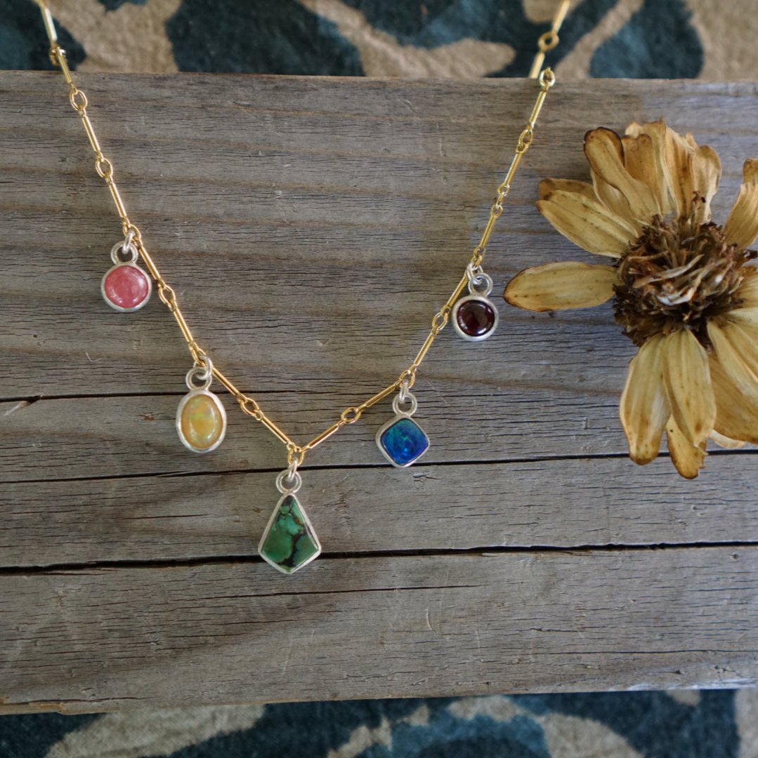 The sweetest little gemstone charm necklace. This beauty is amazing for layering and so cute with all the colors and different gemstones. Pink Rhodochrosite, yellow orange Ethiopian Opal, green Turquoise, blue green Australian Opal and purple Garnet all dripping from a 14k Goldfill bar chain. Necklace measures 15 inches long with a 2 inch extender for adjusting length up to 17 inches long.