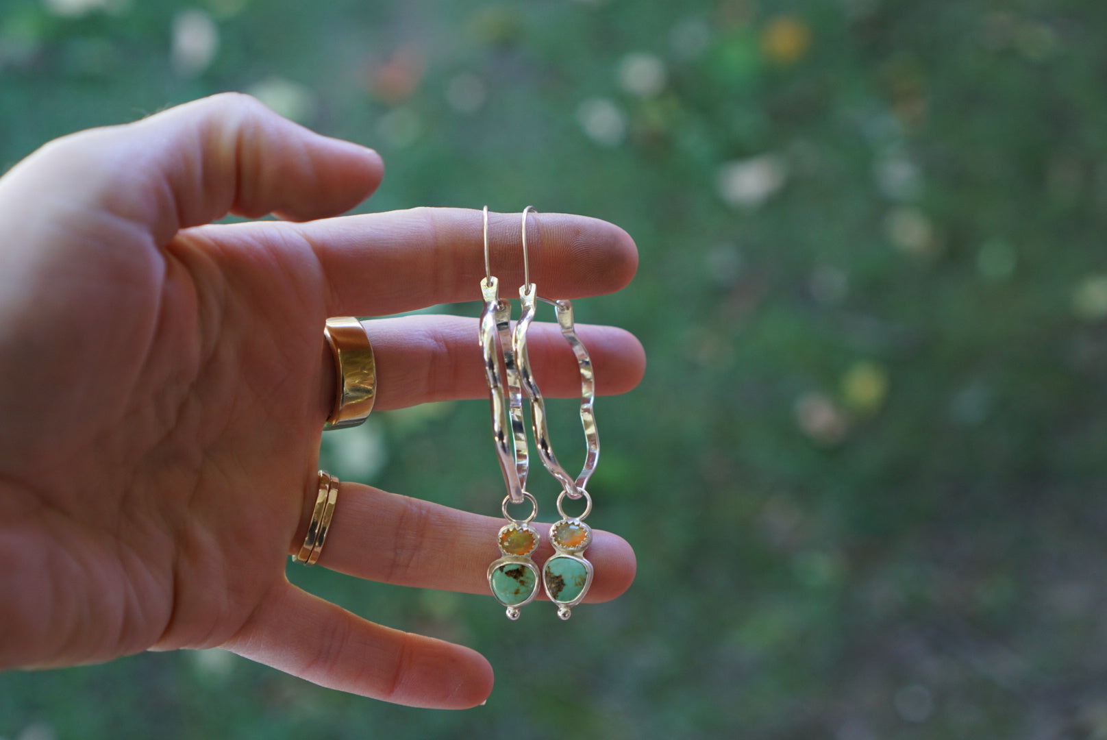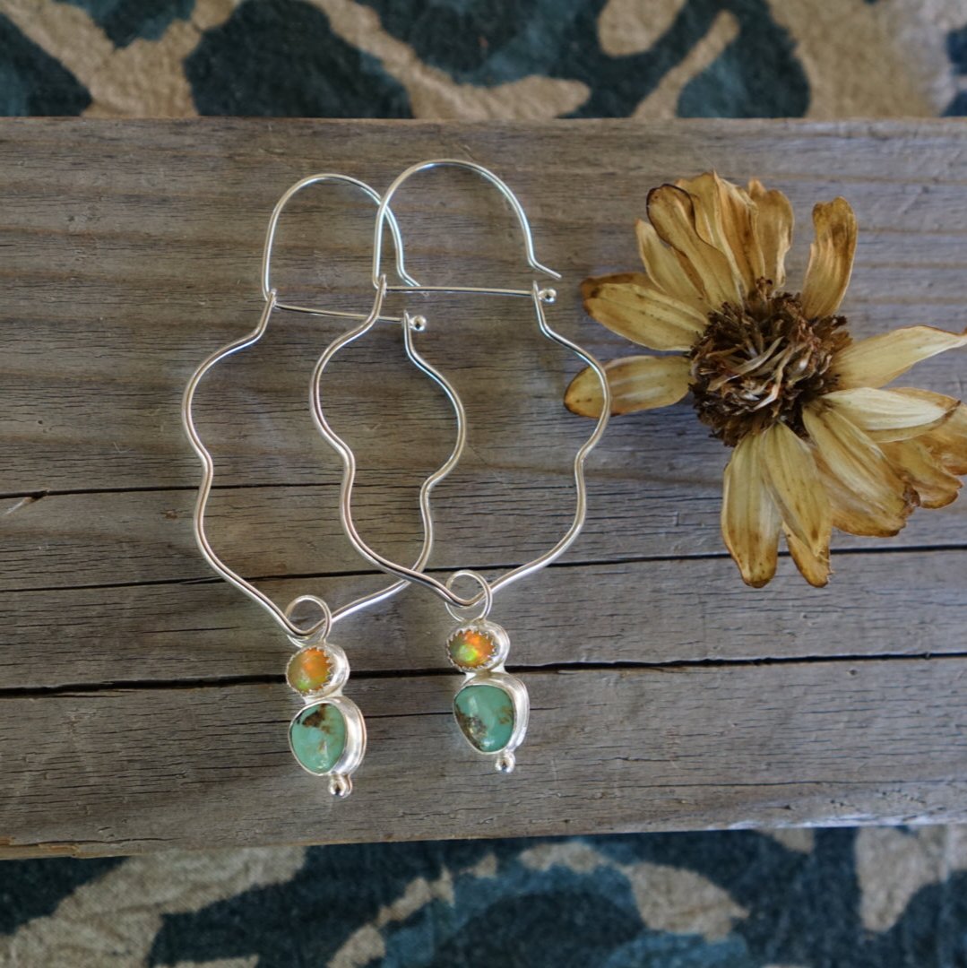 These new Rhode Hook Hoops are an everyday earring must have! They are beautiful, lightweight and have lots of lovely movement. This pair features gorgeous Turquoise and Ethiopian Peruvian Opal gemstones stacked together and wrapped in sterling silver and hanging from hand formed Sterling Silver organic shaped loops with sterling silver hinged hook earwires. Earrings hang about 3 inches long.