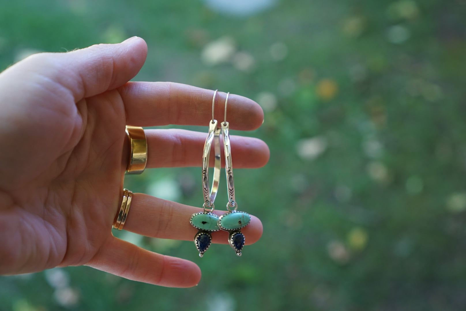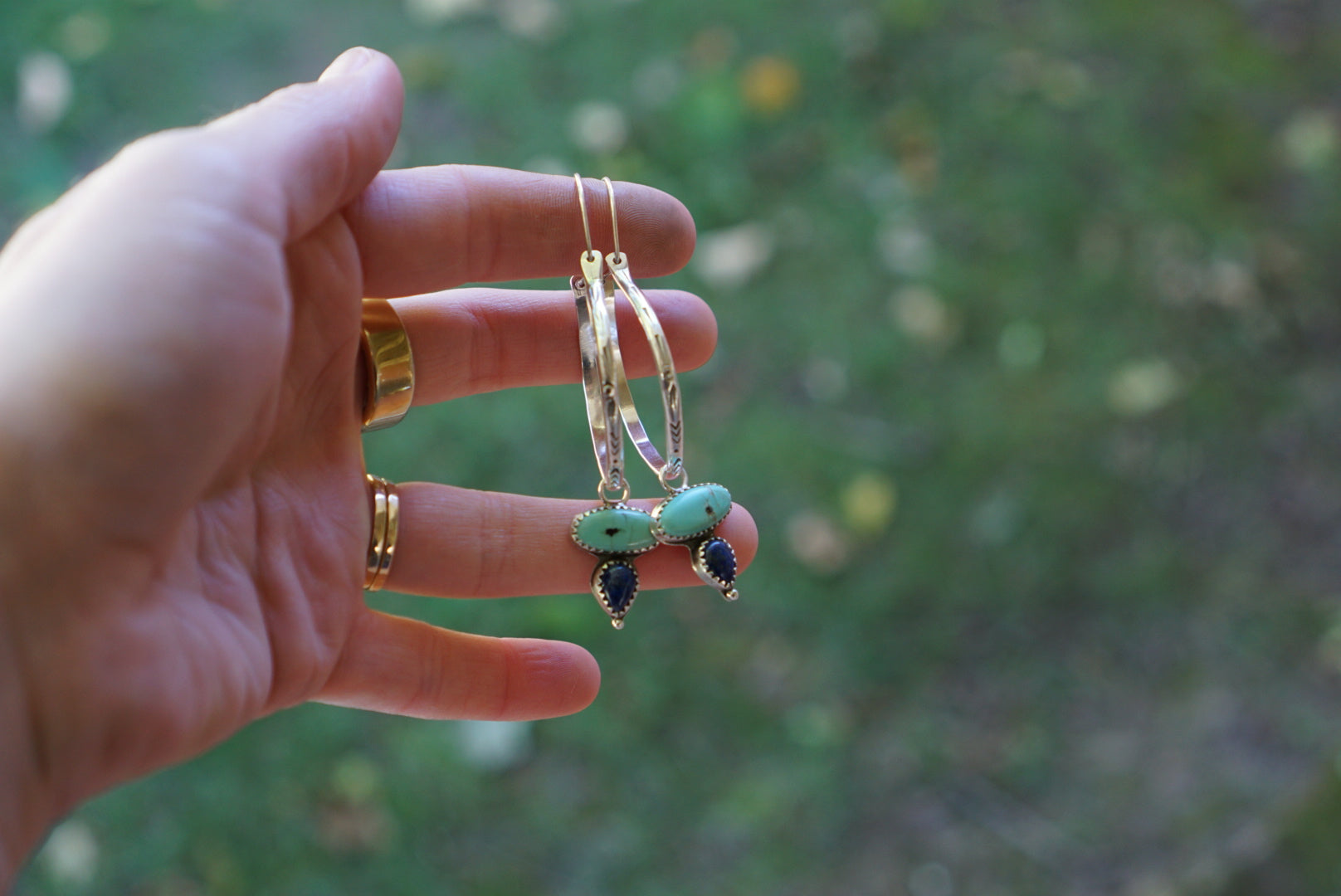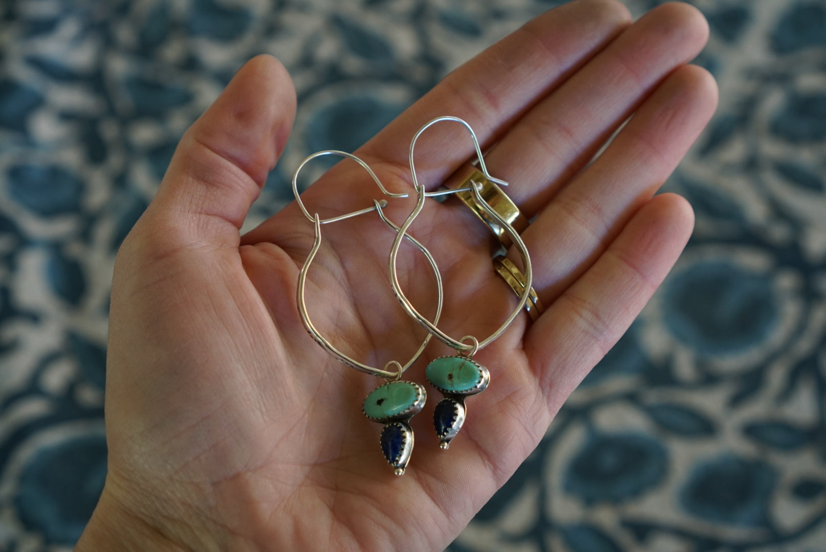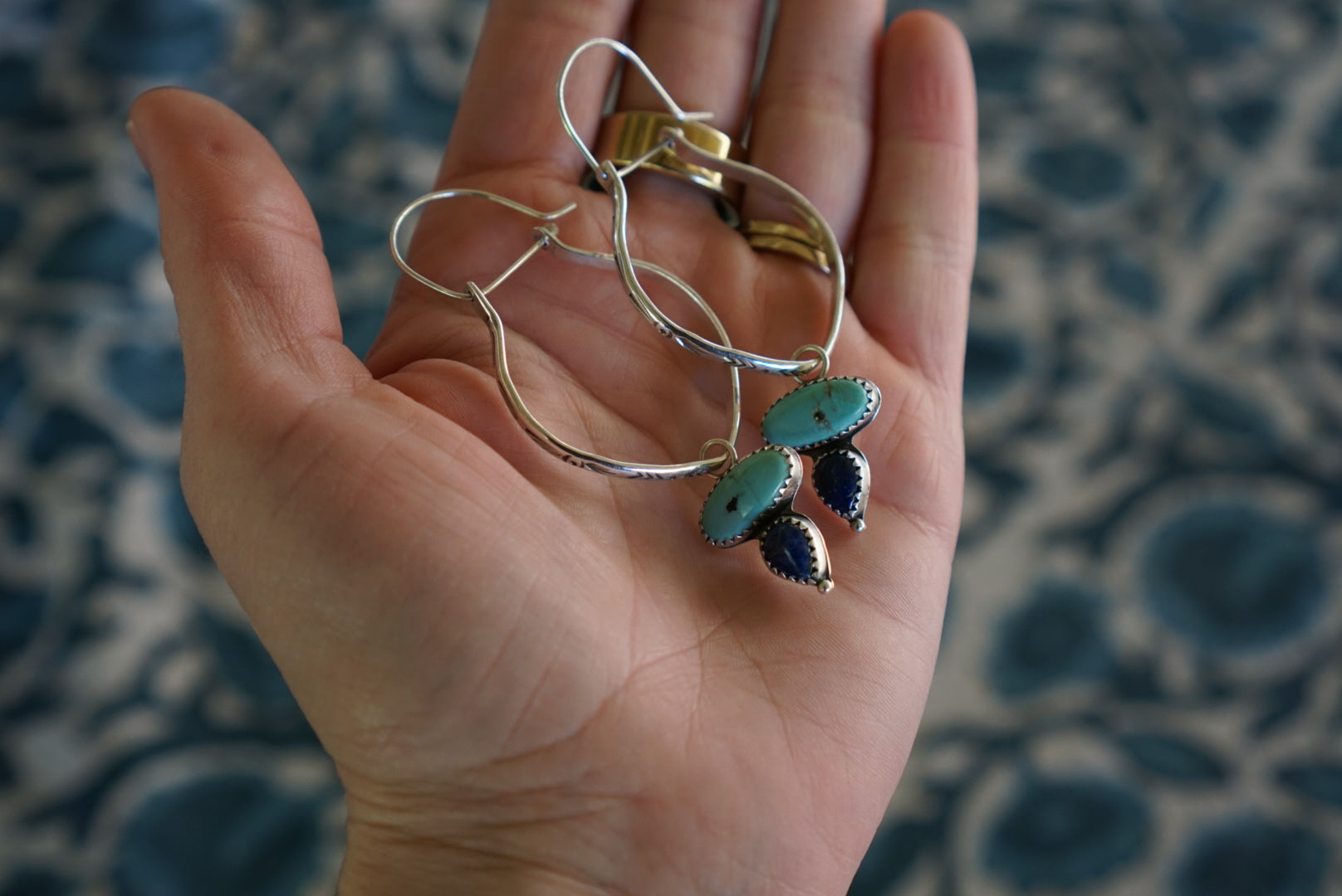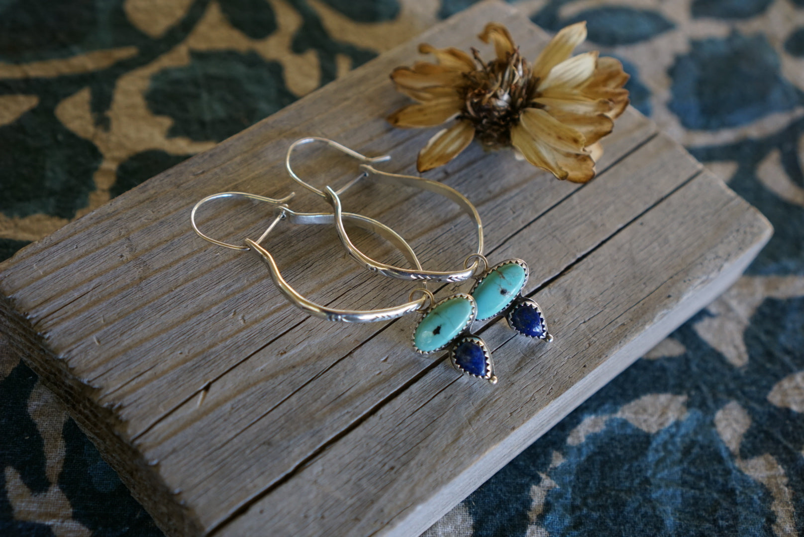 Rhode Hook Hoops- Turquoise & Lapis + Stamped Silver