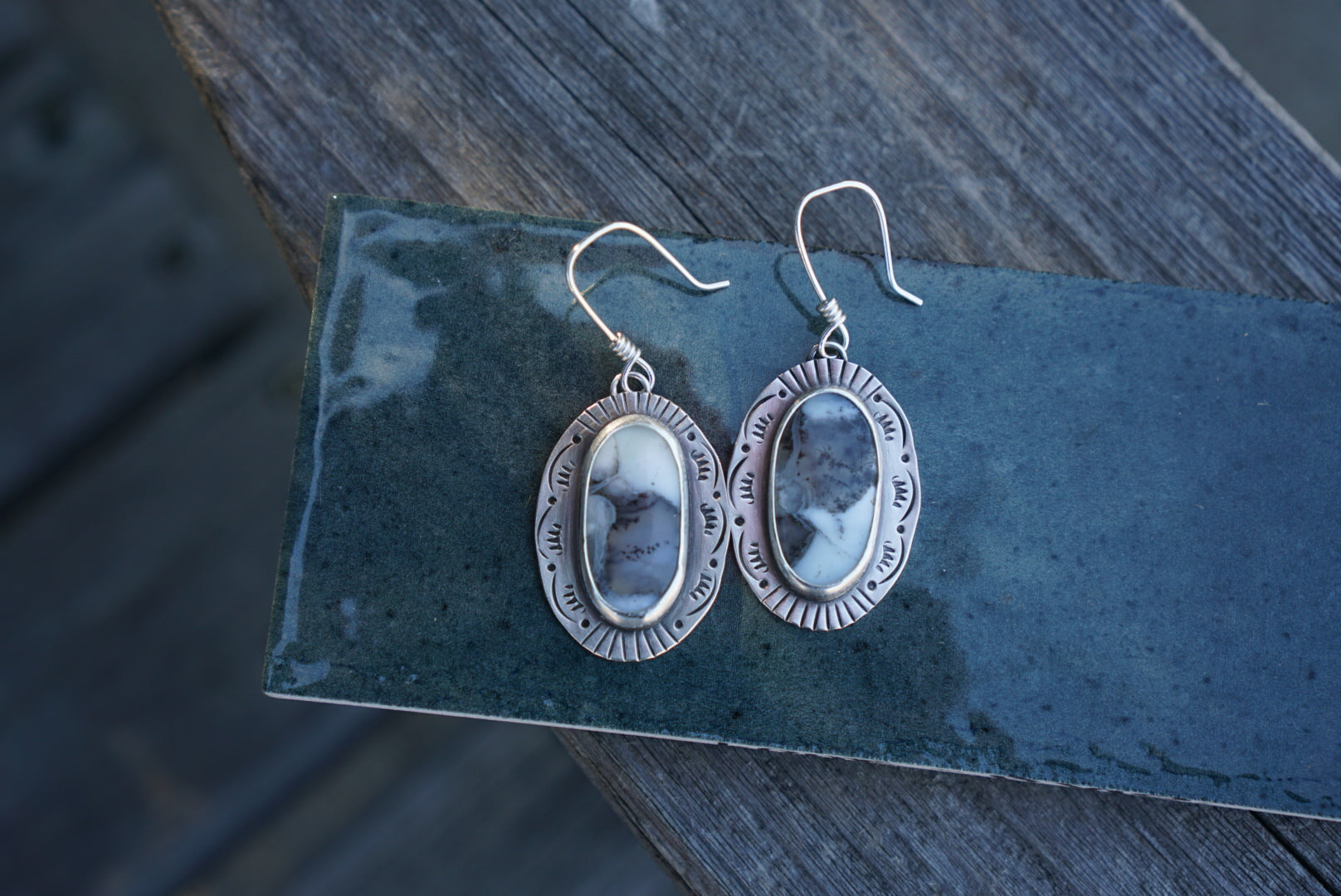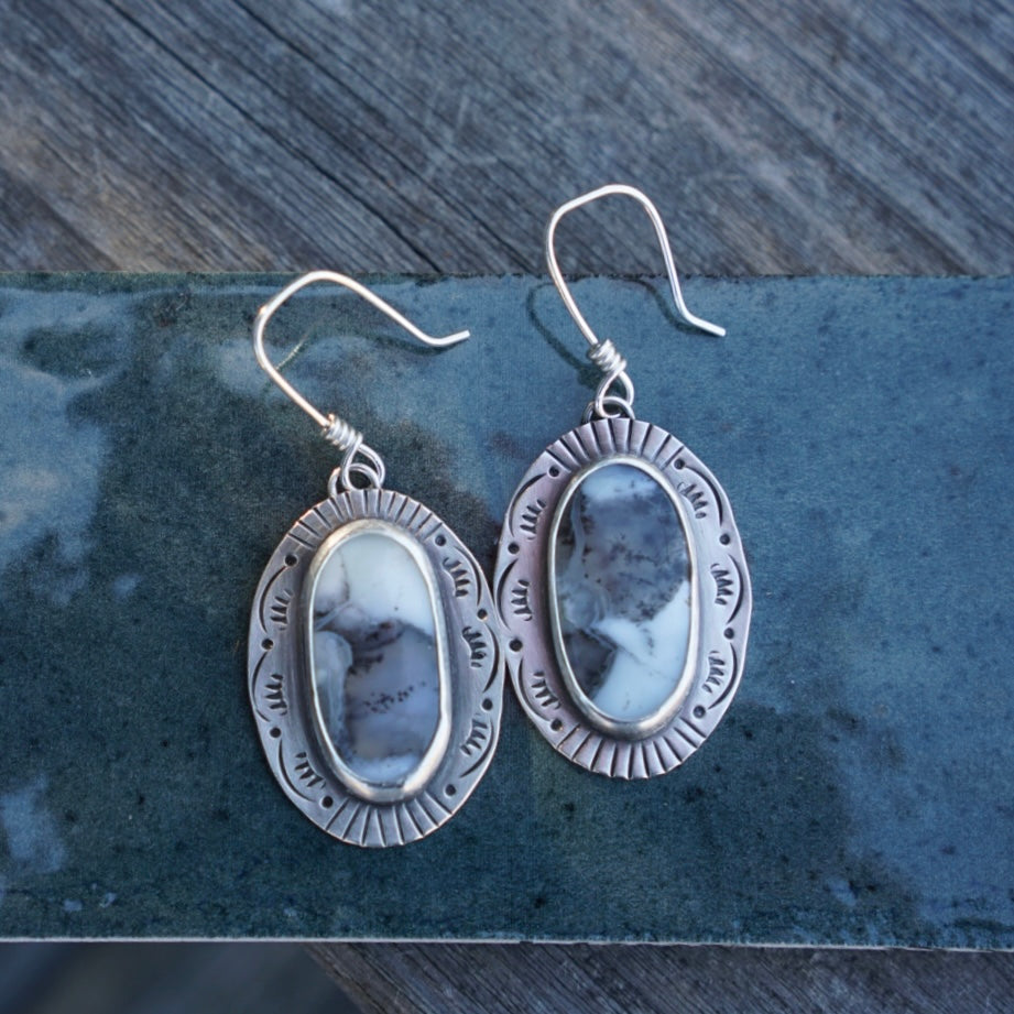 These beautiful earrings are great for everyday. They feature black and white slices of Dendritic Agate stones wrapped in silver and perched on silver discs with hand stamping and sunburst detail around the setting. Finished with sterling silver handcrafted earwires and hang about 2 inches in length.