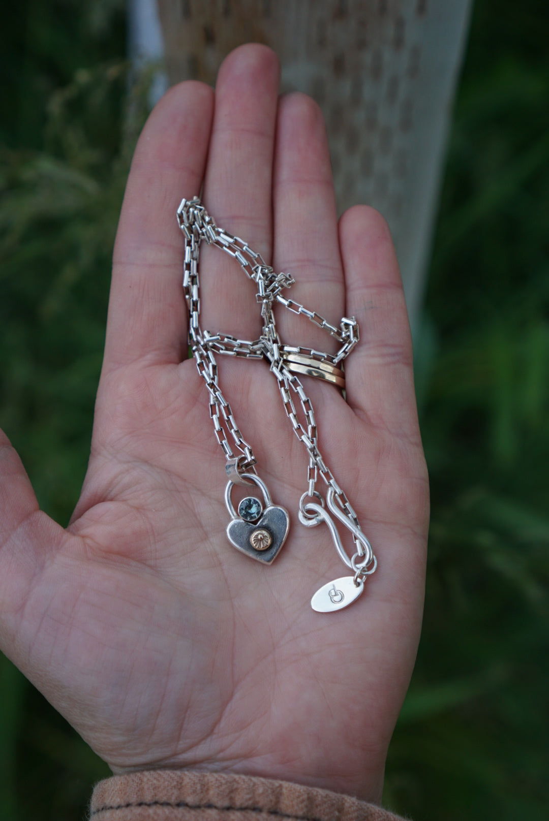I am so obsessed with this necklace. Gorgeous little necklace featuring a stunning Baby Blue hued brilliant cut Montana Sapphire set in sterling silver on a reclaimed and hand forged sterling silver Heart and a stamped 10k solid Gold dot charm in the middle and faux padlock style bail. Pendant hangs from a rectangle paperclip box chain and is finished with a handmade hook and eye clasp. This necklace measures 20 inches in length.