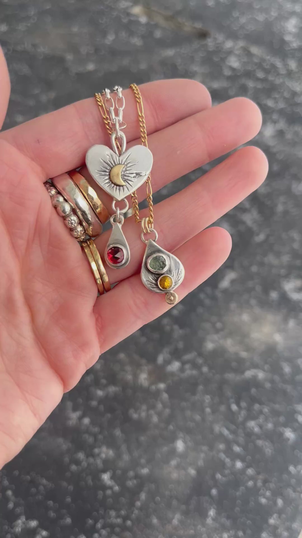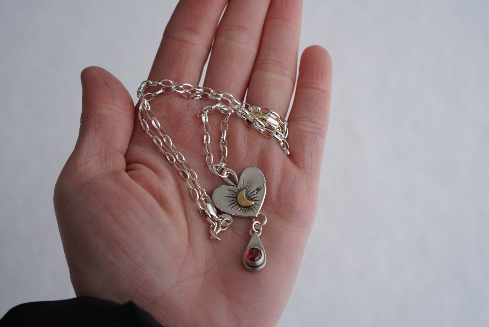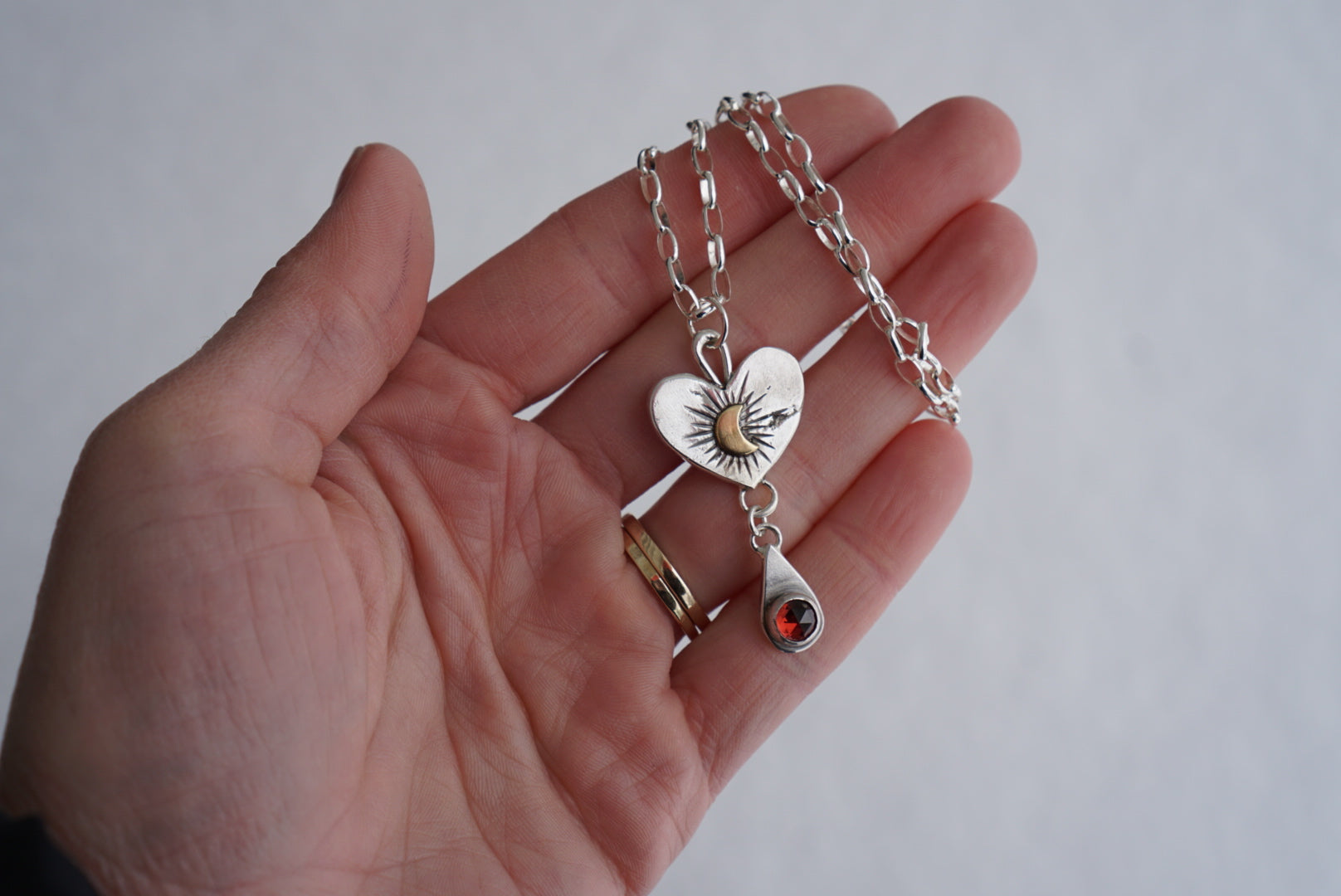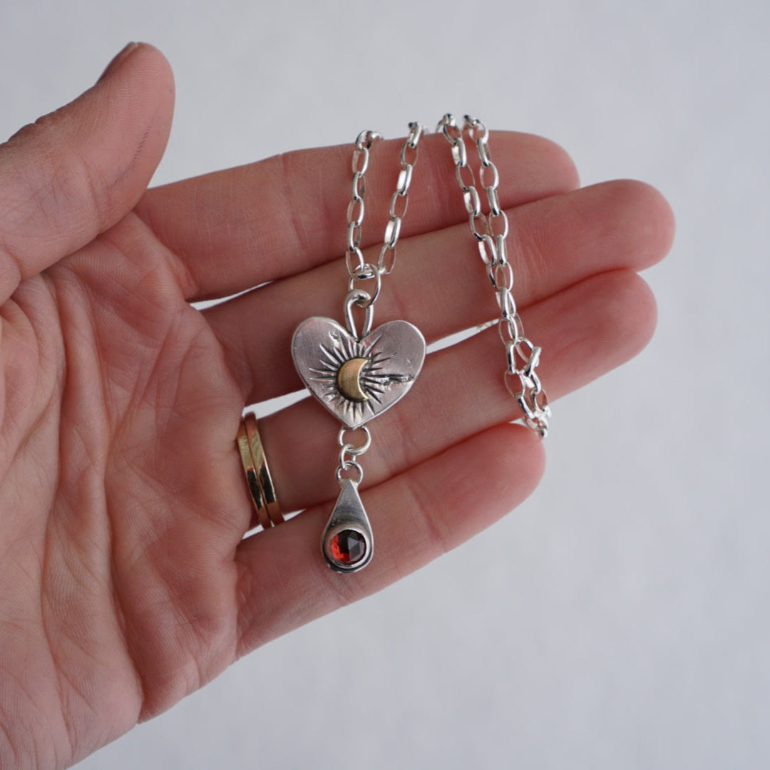 Gorgeous necklace made from reclaimed silver by yours truly. The metal has raw details and texture reflecting the reclaiming process. The hand forged pendant is a beautiful thick silver heart with a golden crescent moon in the center with hand stamped details and a teardrop shaped charm dangling below with a stunning wine colored rosecut Idaho Garnet. This pendant in strung on a sturdy sterling silver oval rolo chain that measures 16 inches in length.