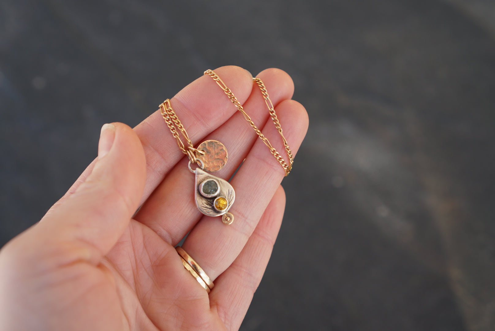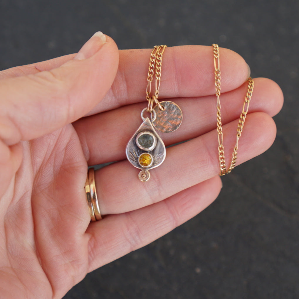 Gorgeous little everyday necklace featuring TWO stunning Montana Sapphires, one brilliant faceted yellow and one light green raw set in sterling silver on a reclaimed and hand forged sterling silver teardrop charm with a 14k solid Gold ball detail and hand stamped details. Accompanying the tear charm is a textured 14k Gold fill disc charm. This beautiful charm set hangs from a 14k gold fill Figaro chain that measures 18 inches long.