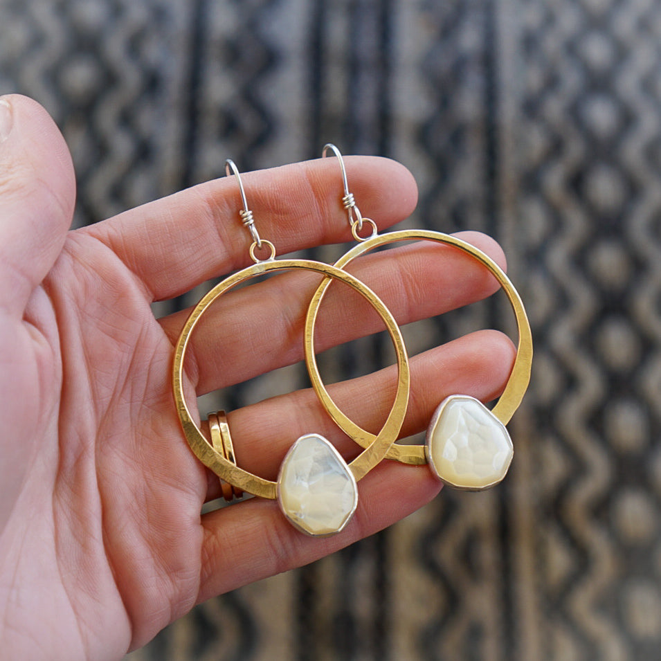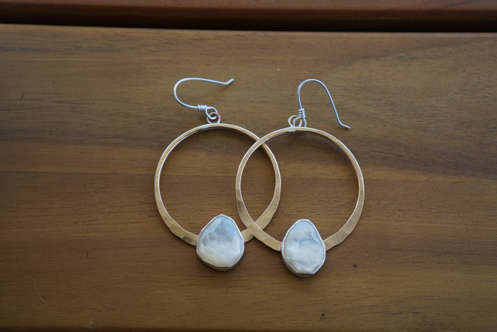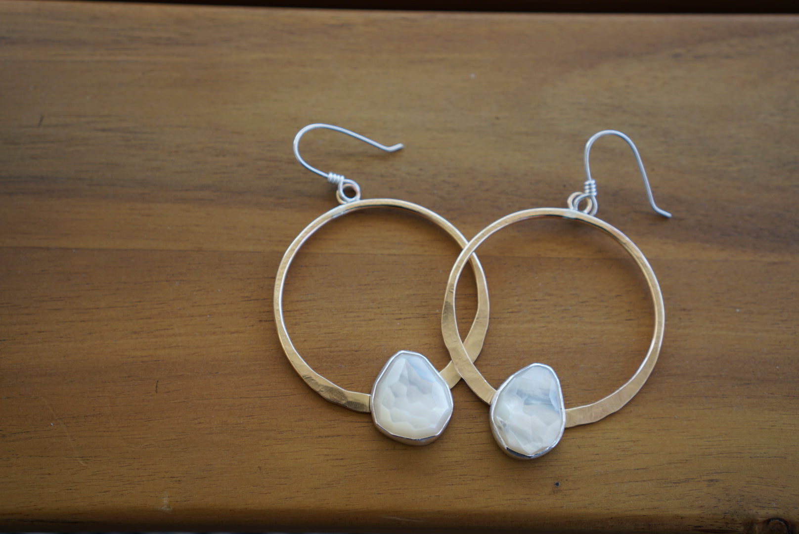 Beautiful medium sized everyday hoops featuring gorgeous rosecut Mother of Pearl gemstones at the base of the hammered hoops. Earrings are completely handmade from brass and sterling silver and dangle from handmade sterling silver earwires. Hoops measure about 1.25 inches in diameter and hang just about 3 inches long and are light and comfy for everyday wear.