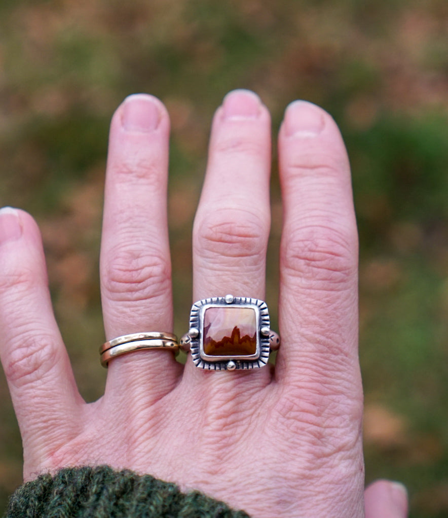 A gorgeous scenic slice of Jasper is simply set in sterling silver with silver ball details and hand stamped line embellishments along the edge. Ring is completed with a thin half round stamped ring band. Best fits a size 8.