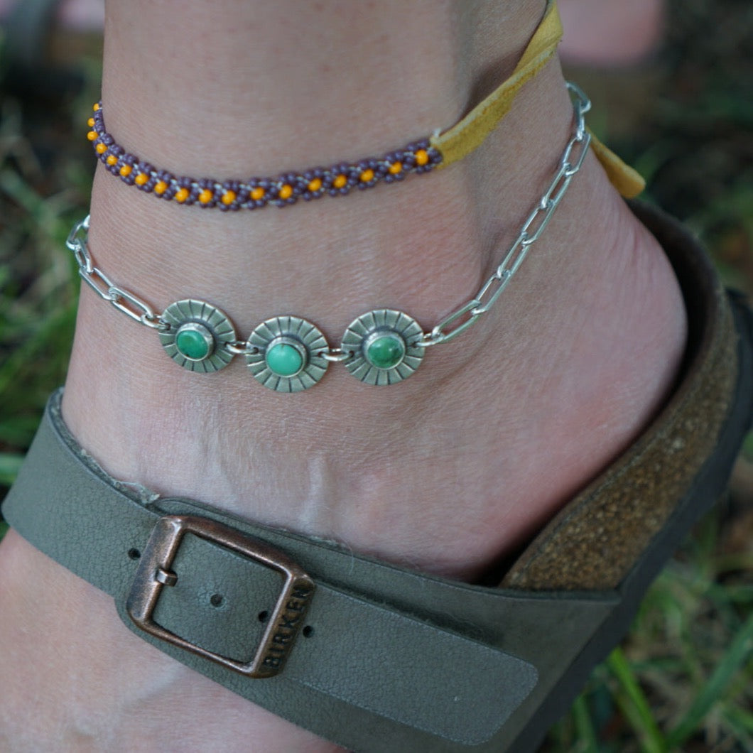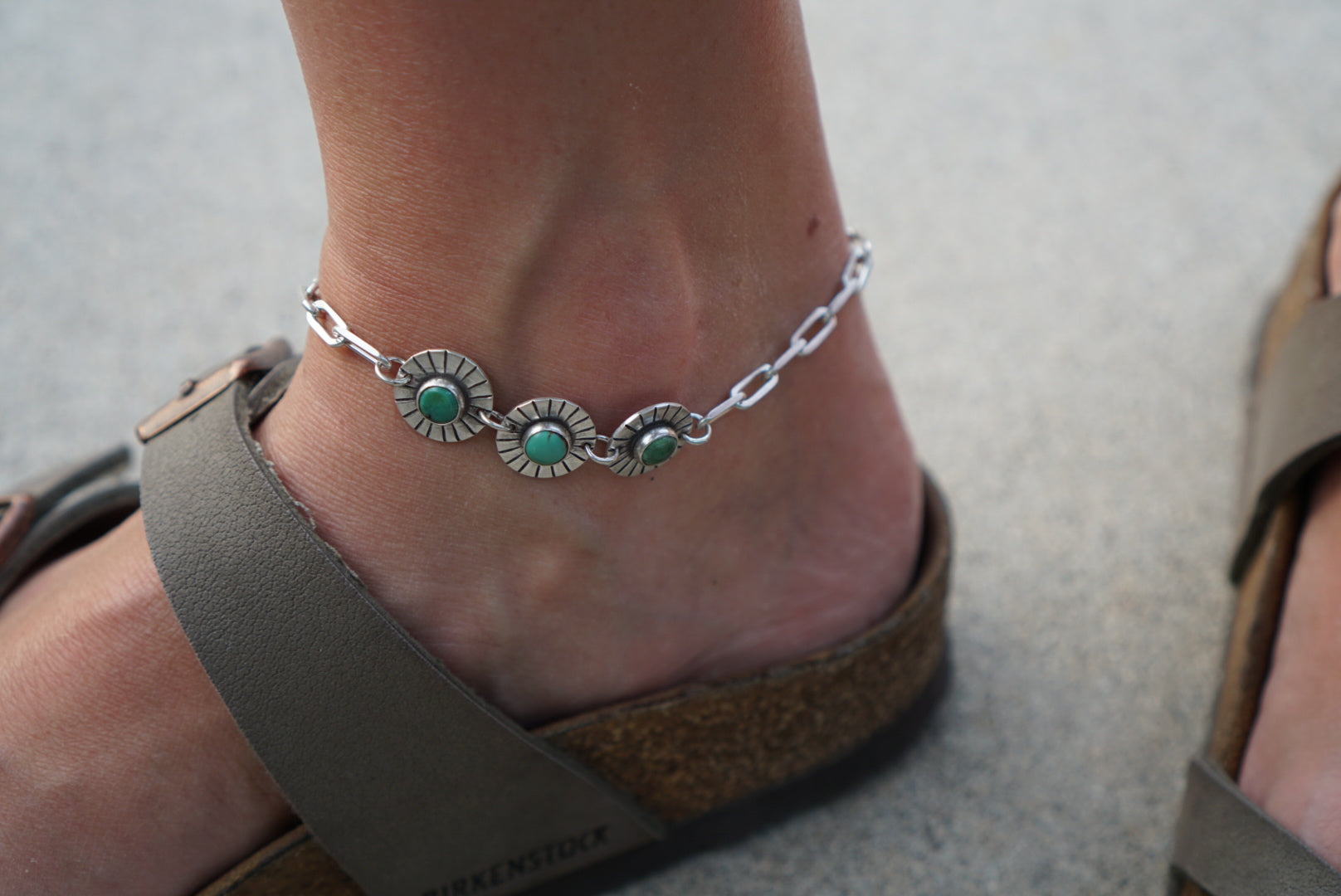 My first ever anklet and I am obsessed. This cute little three disc sunburst design features green turquoise and paperclip chain. This anklet measures 11 inches long and can be adjusted to fit with the lobster clasp attaching to whatever link suits you. Recommended for 7-11 inch ankles