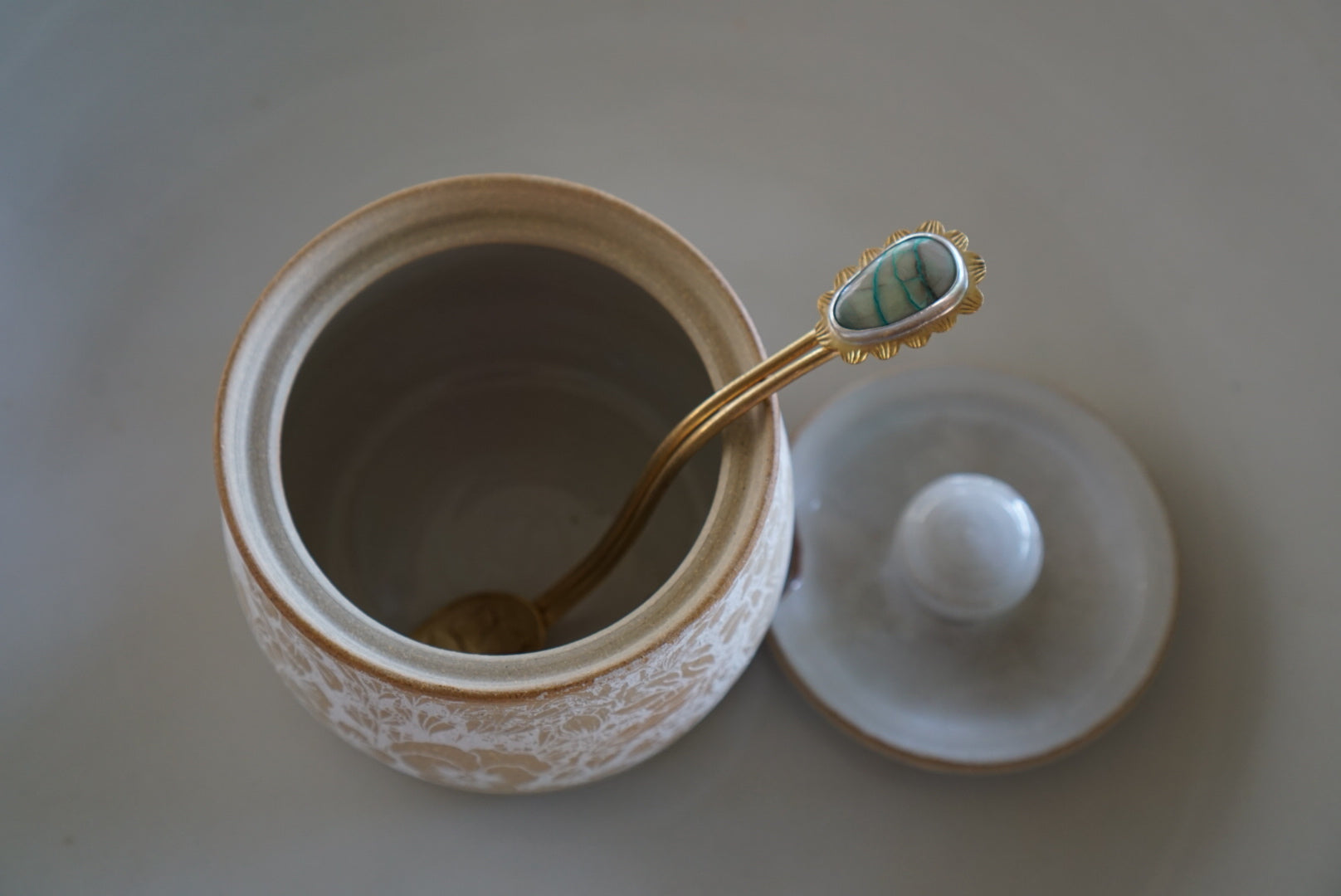 One hand thrown white floral sugar jar and one handcrafted brass and ribbon Chysocolla floral spoon.