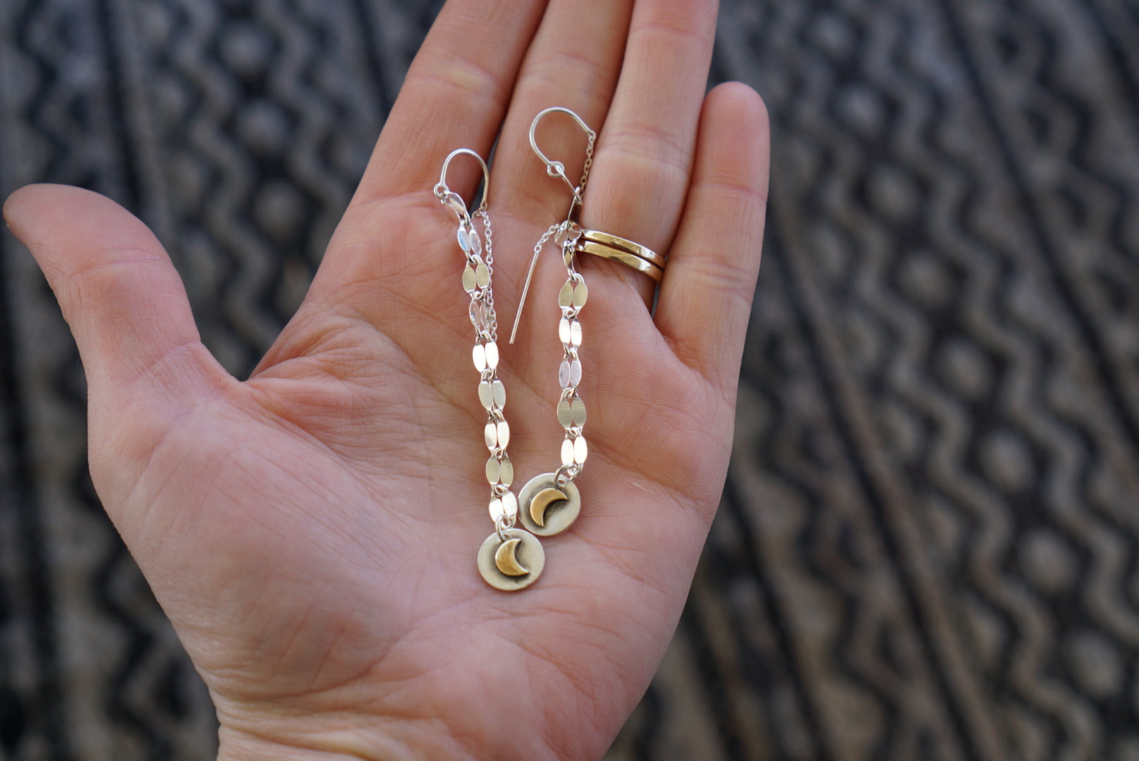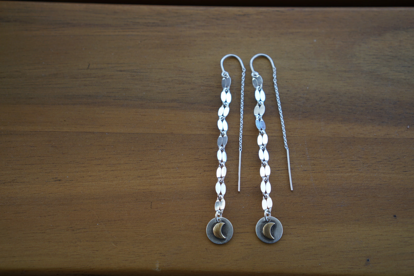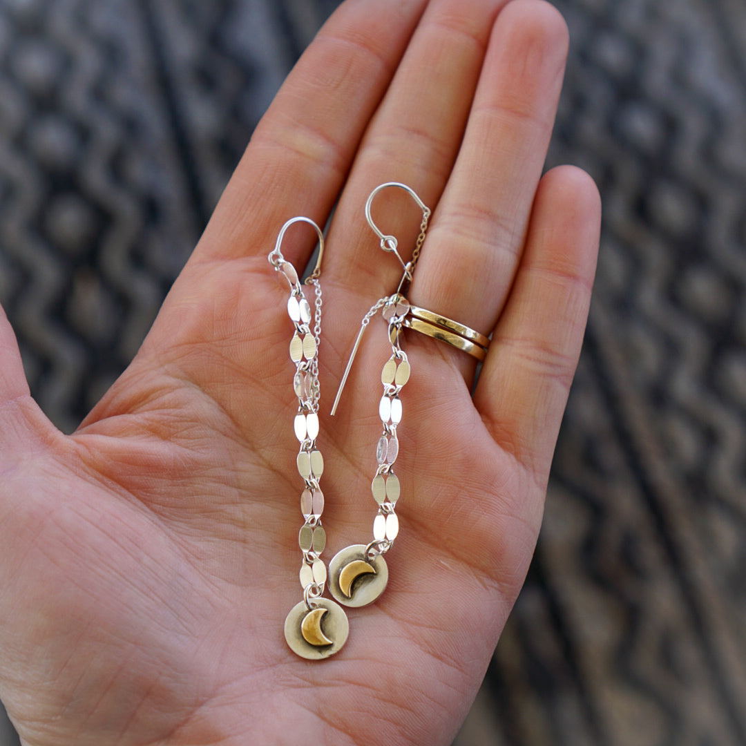 Cute everyday Threader earrings featuring petite moon charms dangling from sterling silver dapped chain. These are hand crafted and completely made of sterling silver. Small and dainty and comfortable these hang just over 3 inches from the top of the threader to the base of the charm.