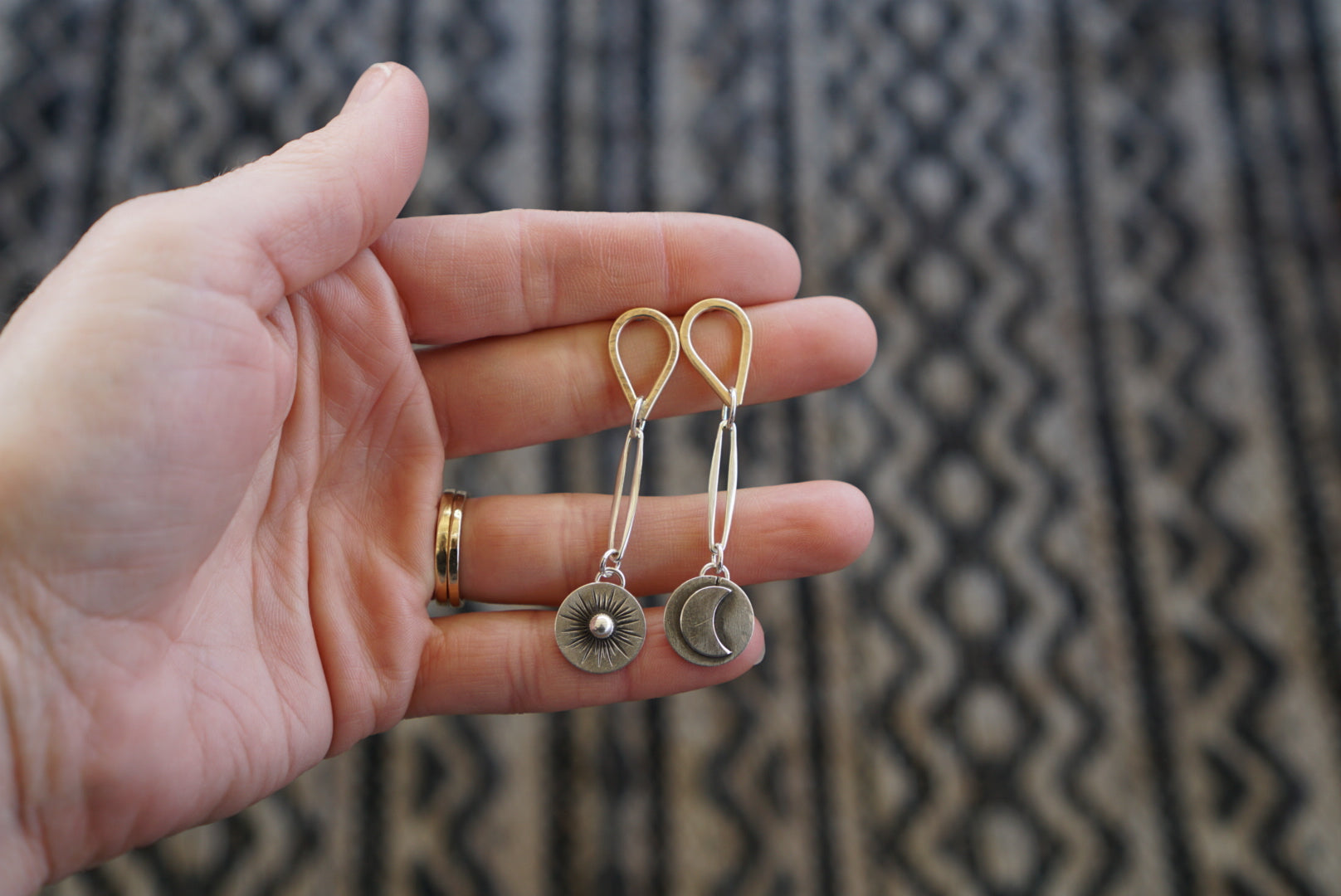 Handmade inverted 14k Gold fill teardrop and sterling silver link earrings featuring one moon charm and one sun charm. These are hand crafted and completely made of sterling silver and 14k Gold fill. Small and dainty and comfortable these hang about 2 inches from the top of the post to the base of the charm and are finished with sterlings silver earnuts.