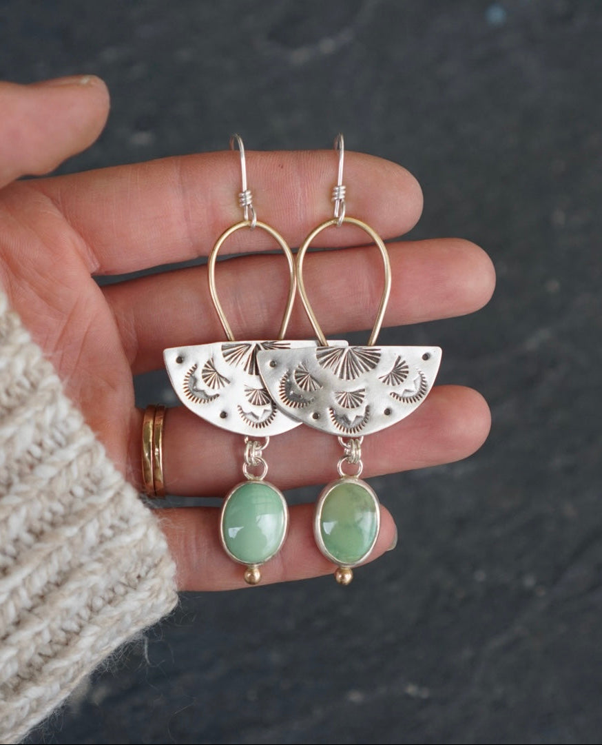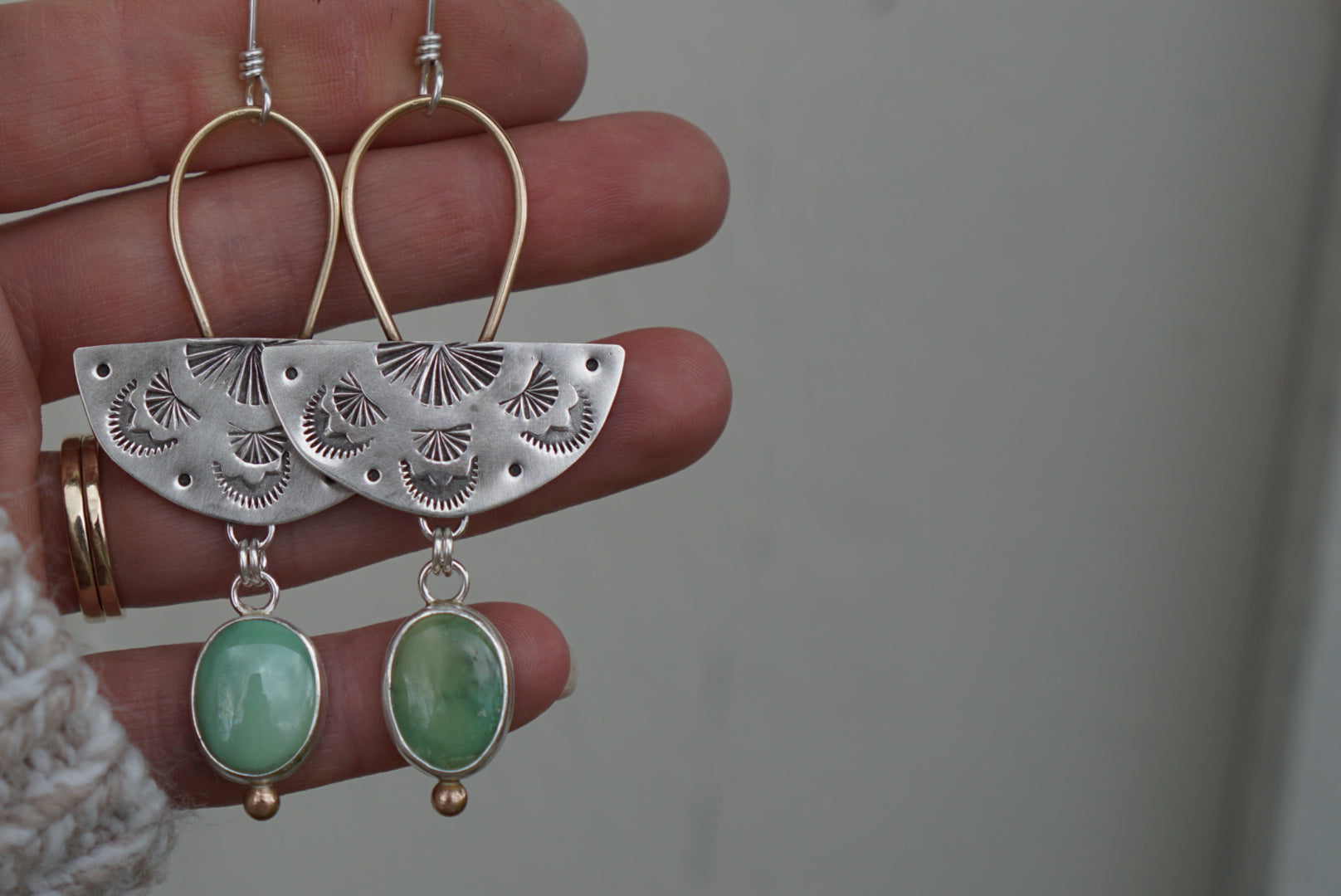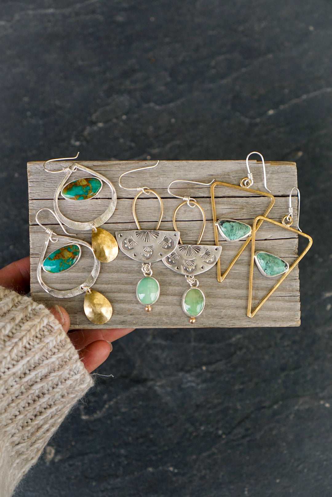 Mixed metal goodness with these gorgeous turquoise earrings! This is a stunning variation on the mixed metal Sundown earrings, this time with lovely green Verde Valley turquoise stones. Half moon shaped stamped silver discs have elongated tear shaped brass loops, and stones wrapped in silver with brass ball details and handcrafted earwires. These earrings hang just over 3 inches long.
