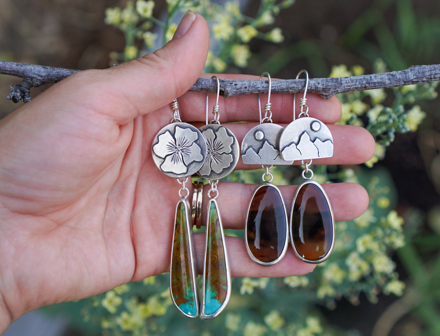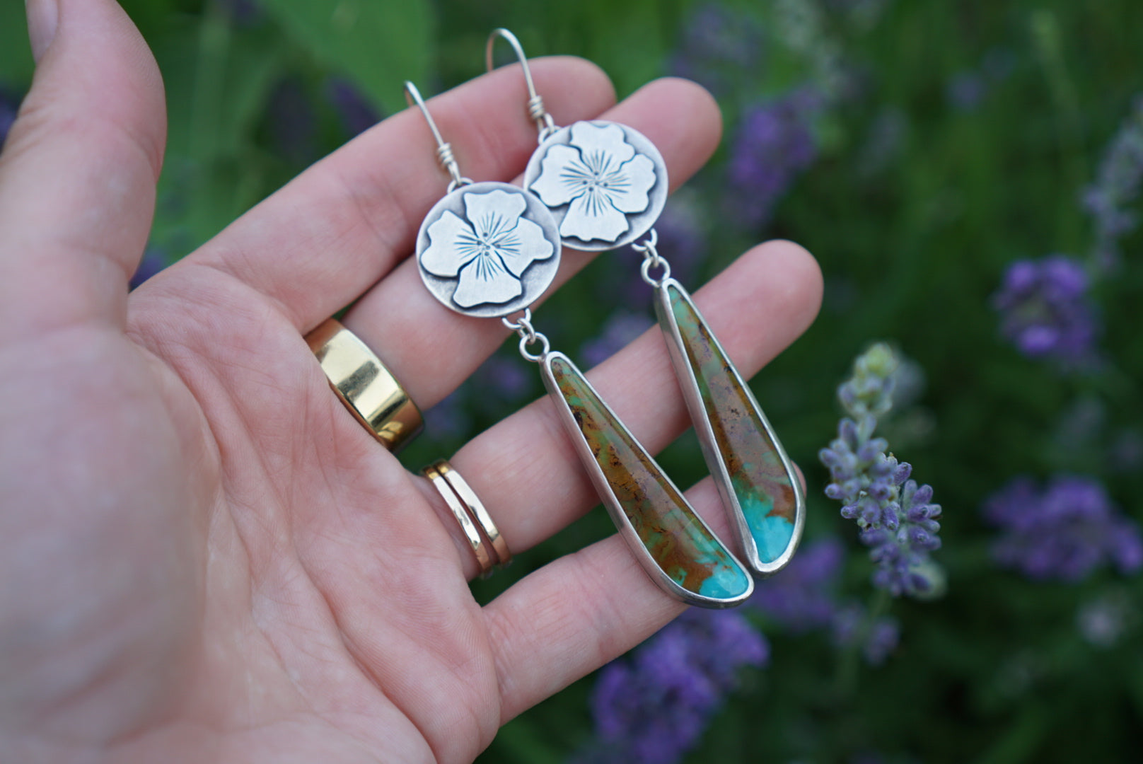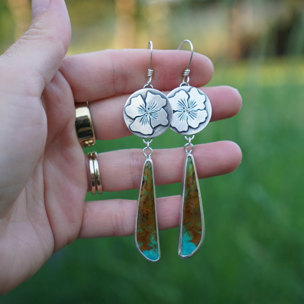 Beautiful earrings featuring gorgeous Turquoise gemstones dangling below handmade flower appliqué discs. Earrings are completely handmade and dangle from handmade sterling silver earwires. Earrings measure about 3.5 inches in length.