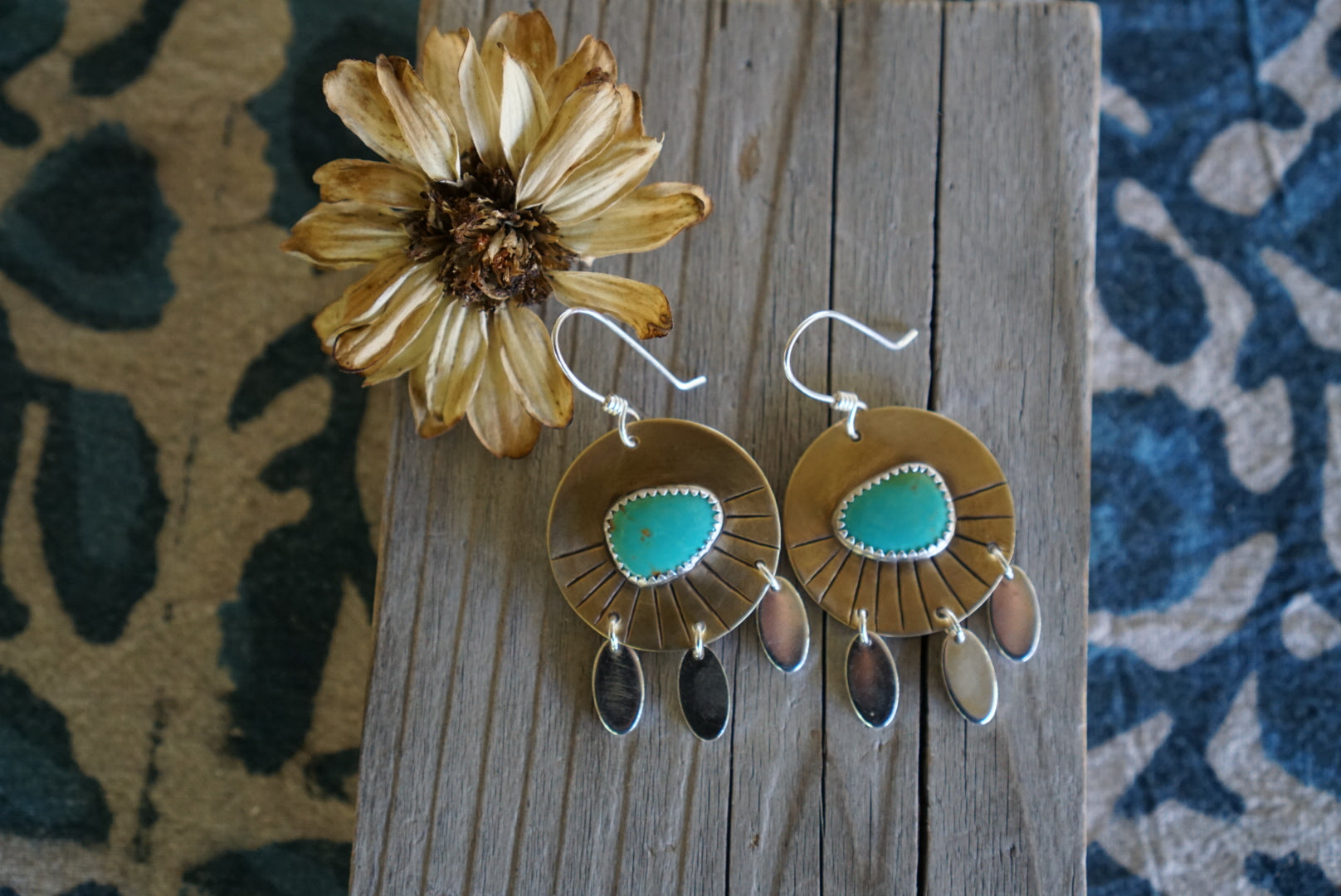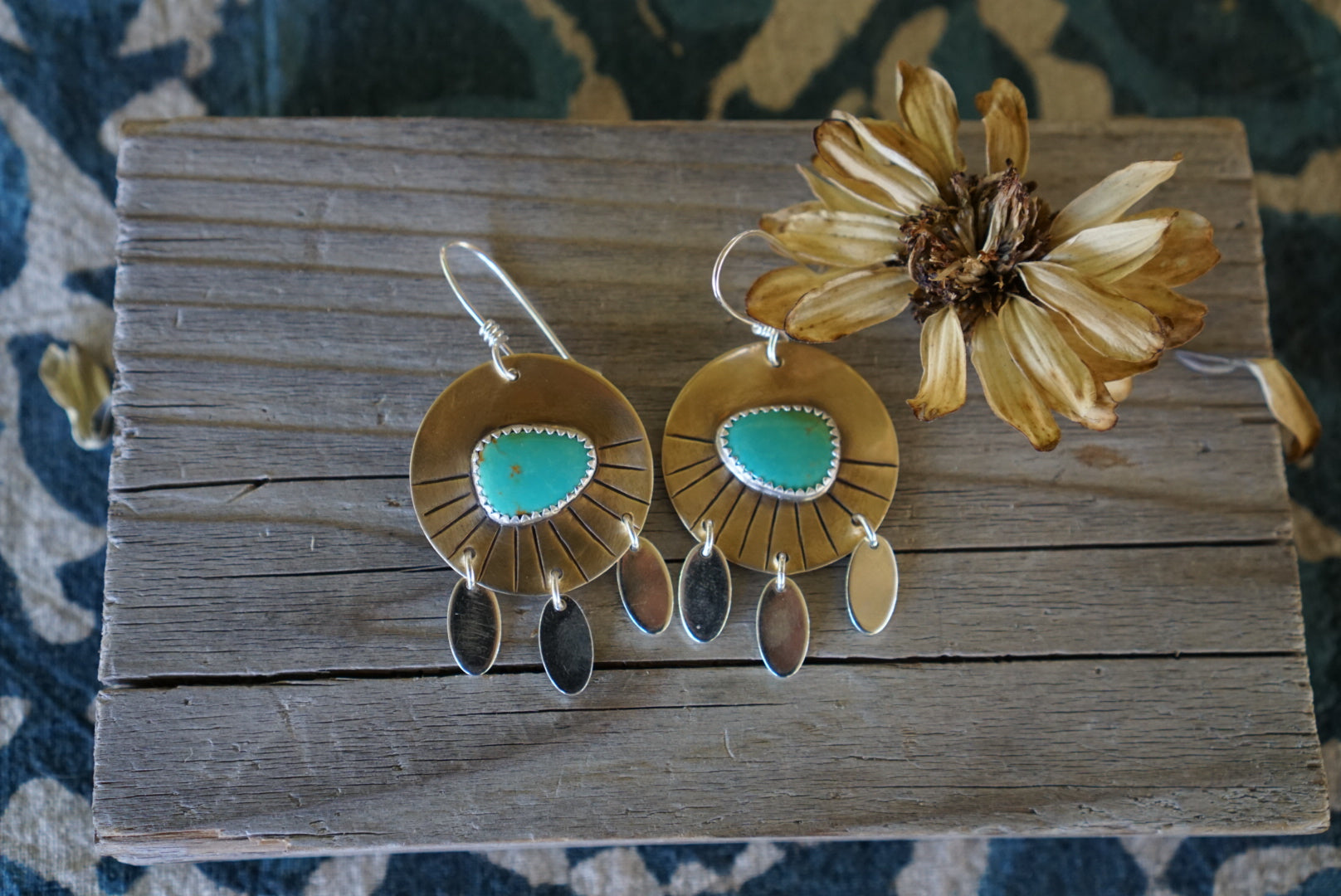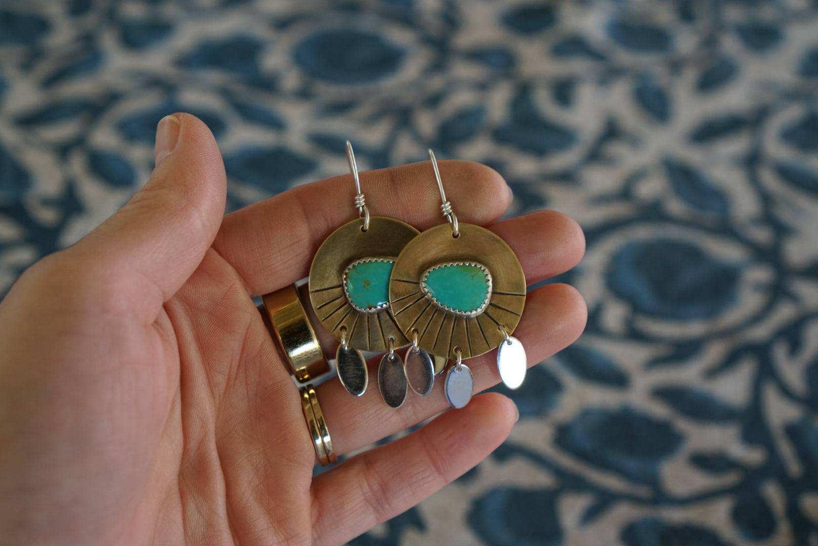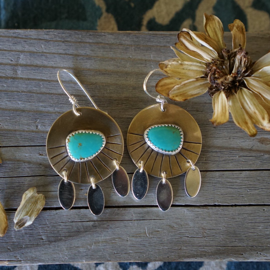 Beautiful medium sized everyday earrings featuring gorgeous Sonoran Gem Turquoise with a beautiful blue green matrix. Earrings are completely handmade from rustic antiqued brass discs and sterling silver dangles with some hand stamped details along the bottom edge. These dangle from handmade sterling silver earwires. Earrings measure about 1.25 inches in diameter and hang just over 2 inches long and are light and comfy for everyday wear.