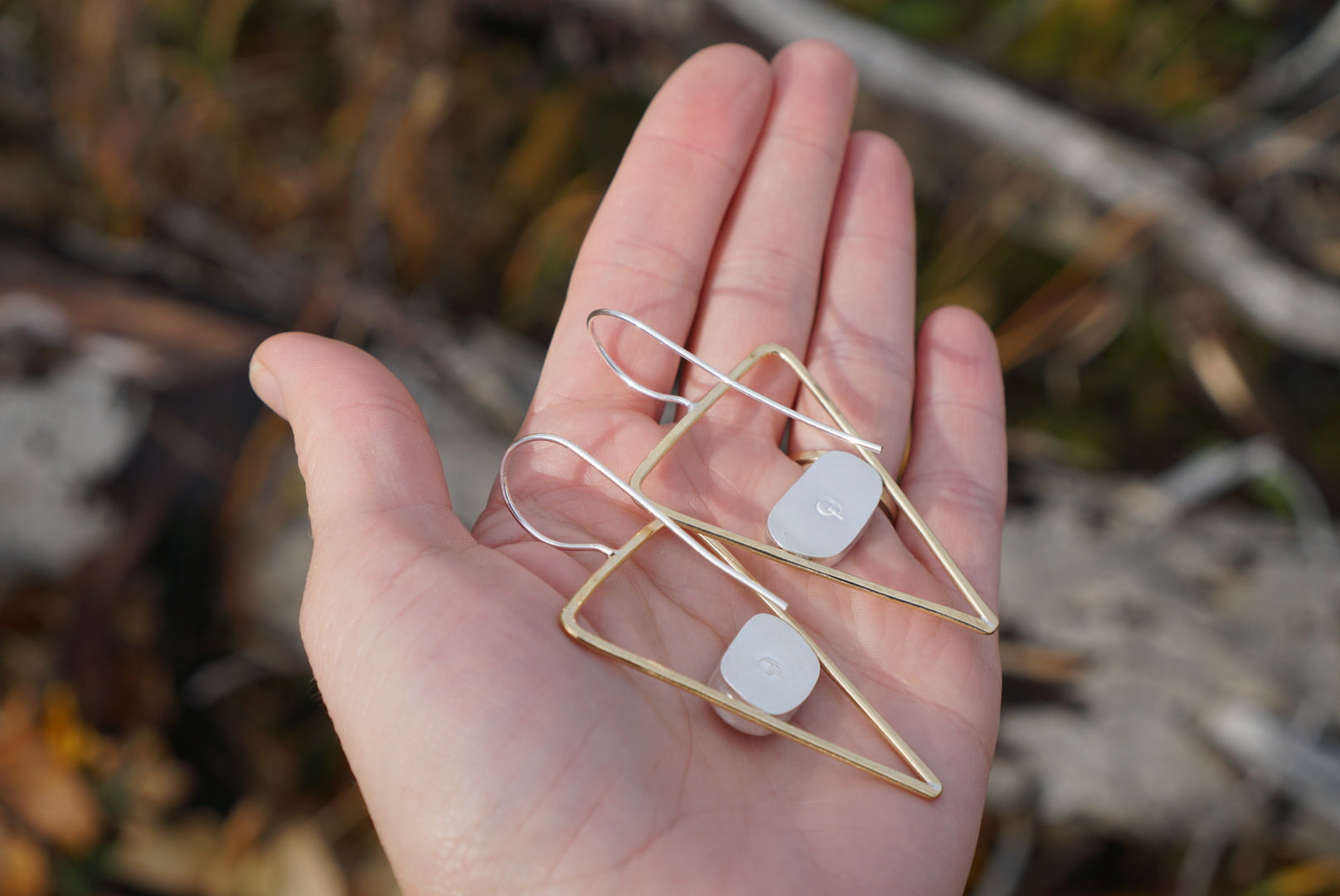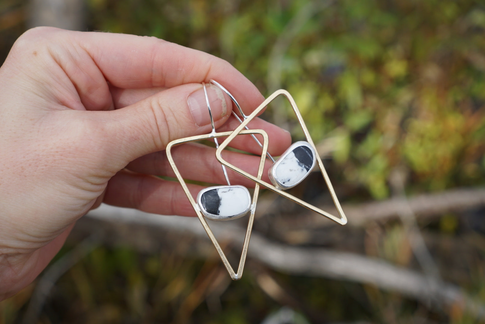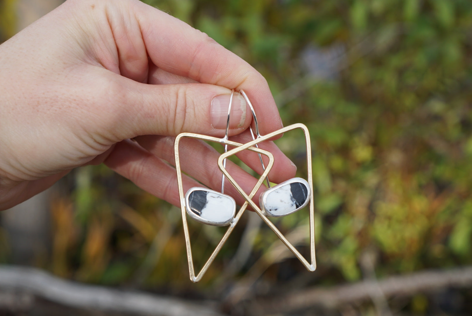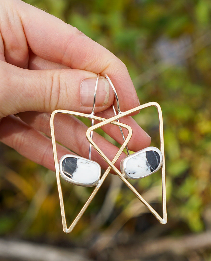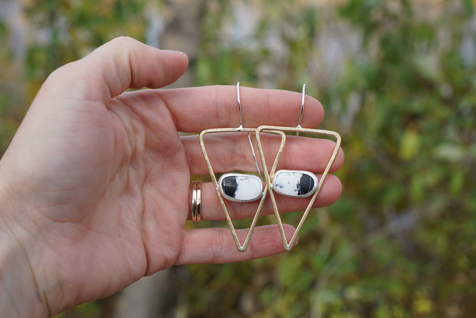 An O+P classic! Hand forged brass triangles, completely formed, soldered and hammered by hand with beautiful black and white White Buffalo Turquoise gemstones set in recycled sterling silver and nested inside the triangle. Finished with handcrafted sterling silver threader earwires. These measure just over 2.5 inches long.