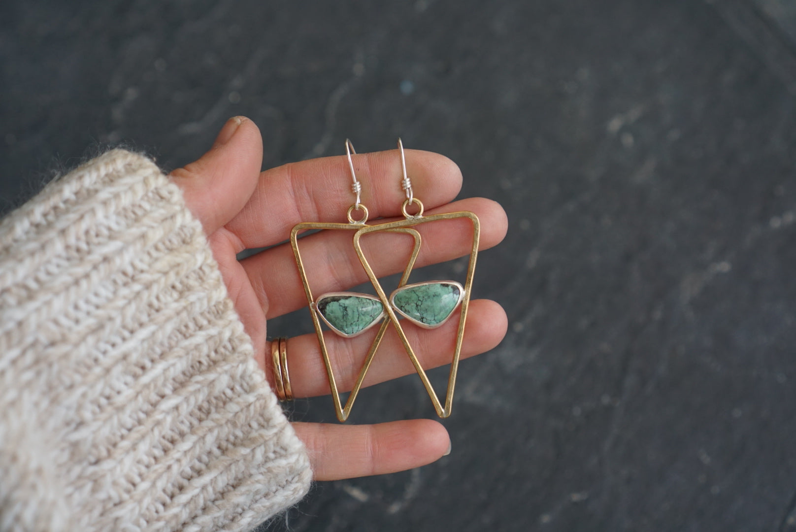 An O+P classic! Hand forged brass triangles, completely formed, soldered and hammered by hand with beautiful minty green and black webbed Poseidon Variscite gemstones set in recycled sterling silver and nested inside the triangle. Finished with handcrafted sterling silver earwires. These measure just about 2.75 inches long.