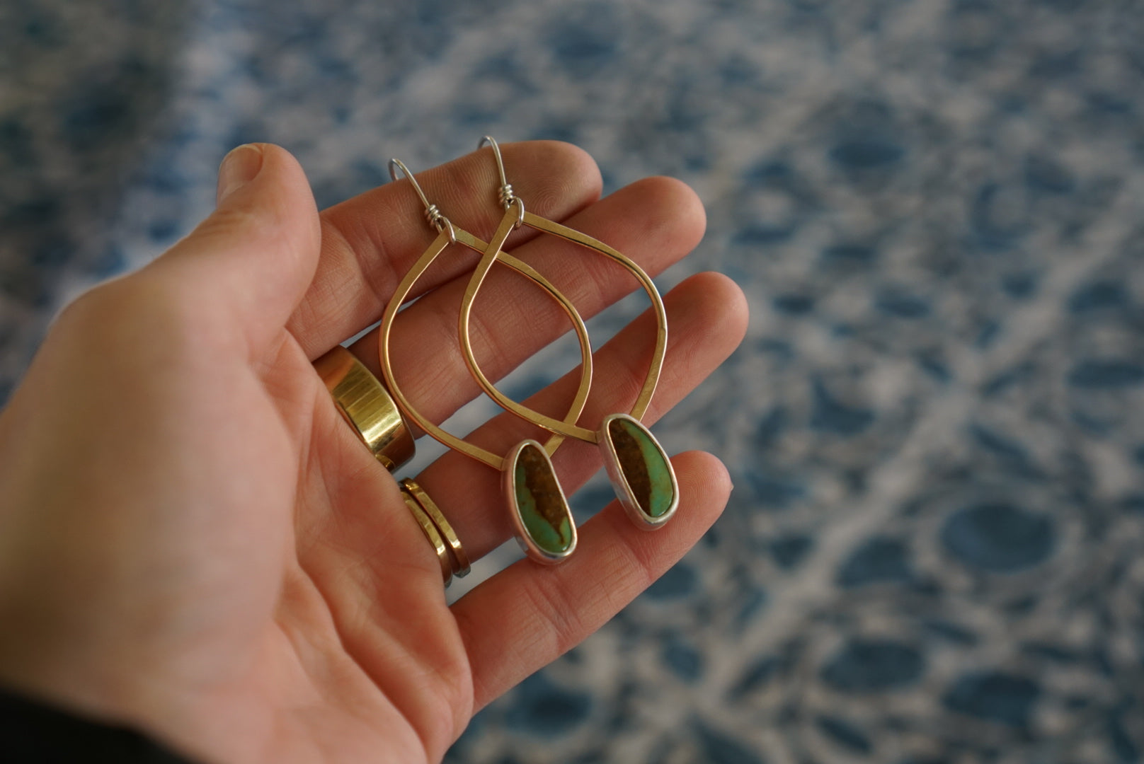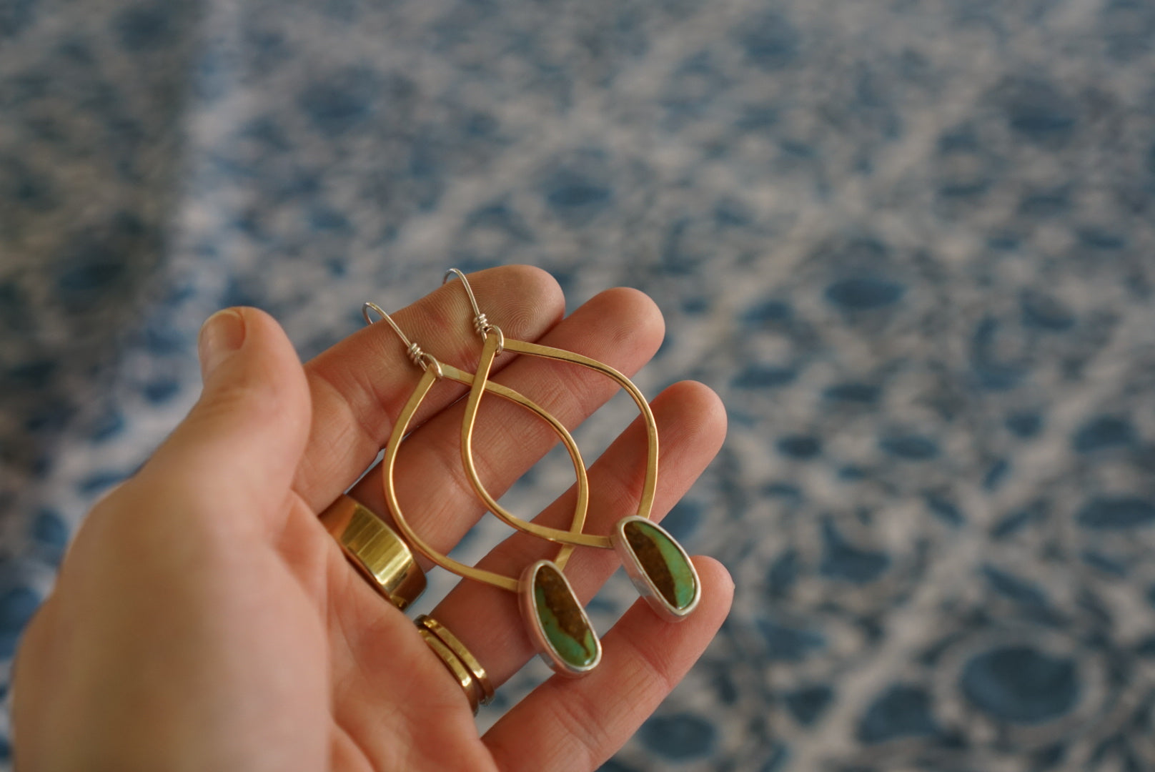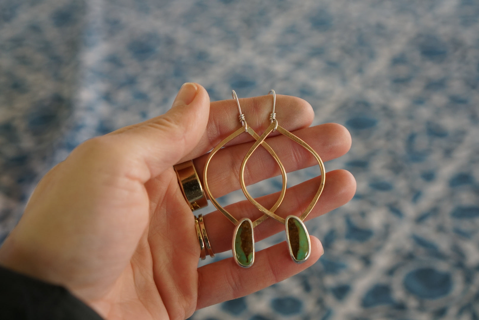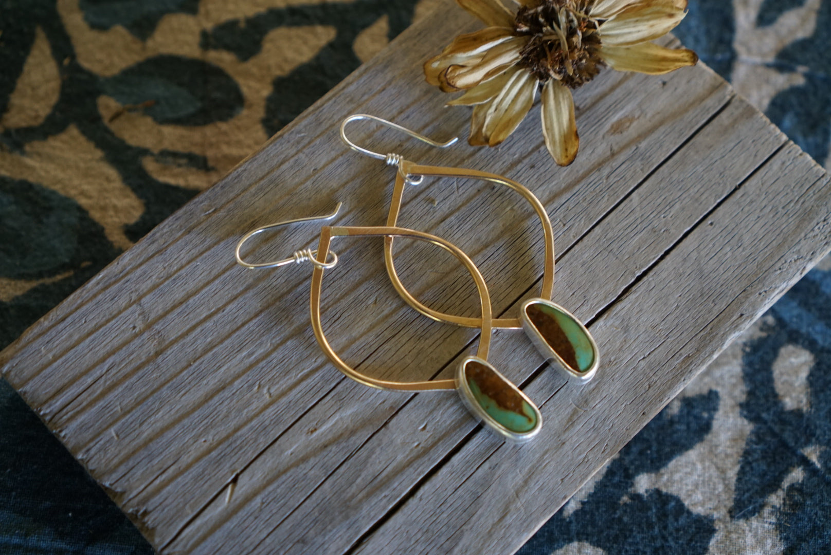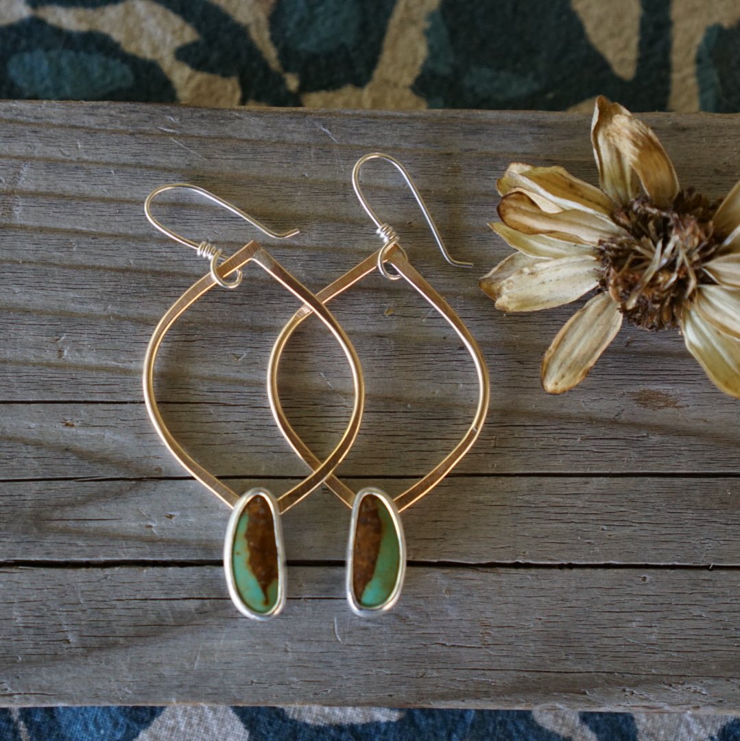 Classics!! My favorite almond shaped hoops are hand crafted in warm golden 14k gold fill with lovely Green Royston Turquoise stones wrapped in sterling silver dangling below. Finished with handmade sterling silver earwires and measuring about 2.75 inches in length. Simple, beautiful and perfect for every occasion.