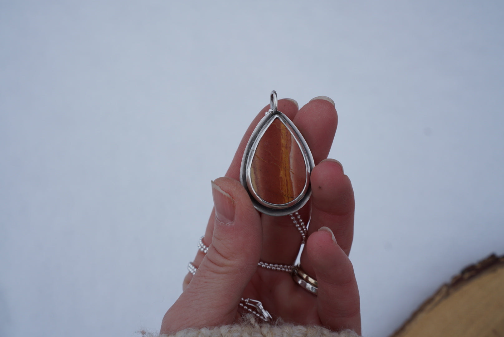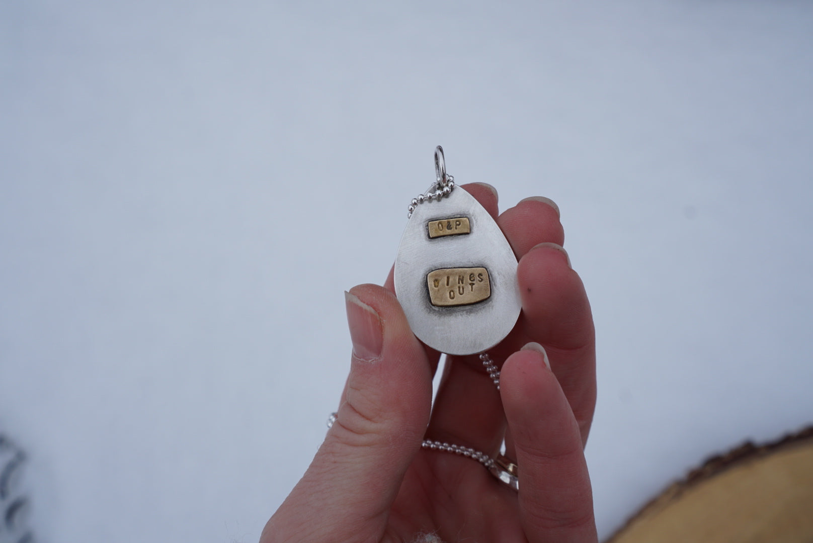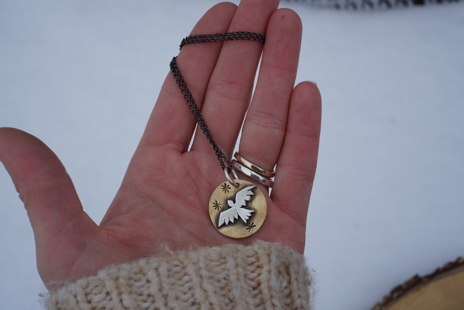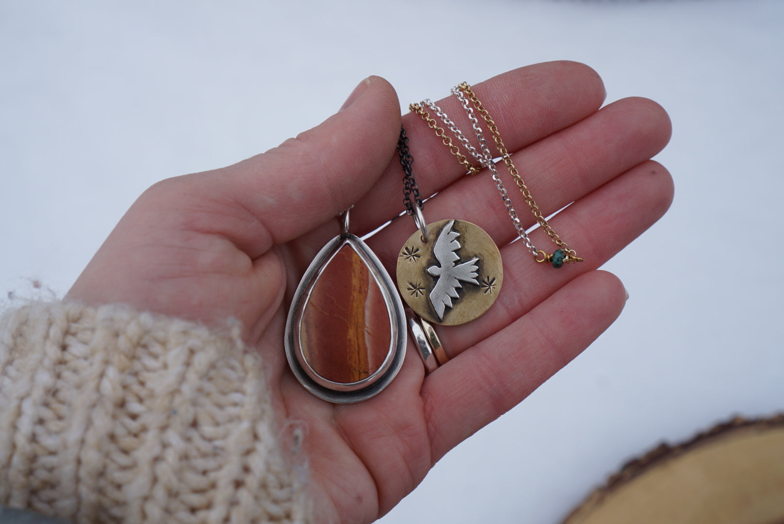 Fun and beautiful necklace set including three necklaces that can be worn layered together or all on their own. This set includes a 16 inch simple fine and dainty necklace made with mixed metals of 14kt gold fill and sterling silver with a little turquoise bead detail, an 18 inch oxidized sterling silver chain with a starry night bird pendant, and a 22 inch ball chain with a statement pendant of Utah Wonderstone in the prettiest pink and orange matrix; on the back is hand stamped details of the words "Wings Out", reminding the wearer to live life with their wings out.